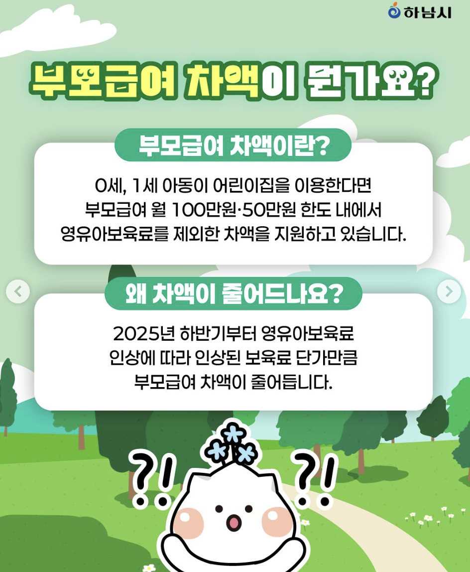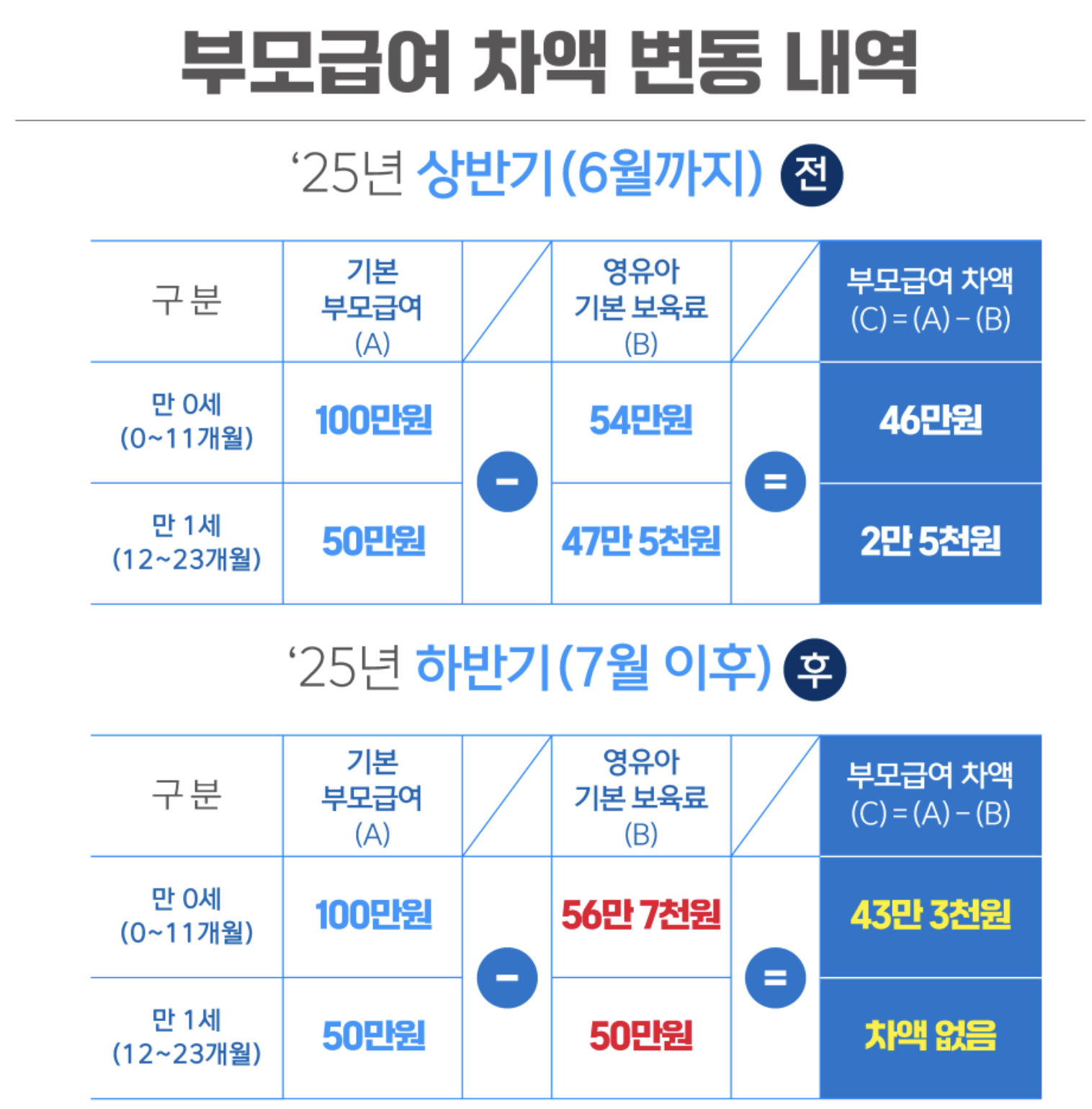 - 2025년 하반기부터 보육료 단가가 인상되면서, 일부 연령대에서는 바우처 금액이 부모급여 기준금액을 초과하게 되어 차액이 0원이 되는 가정도 발생할 수 있습니다.