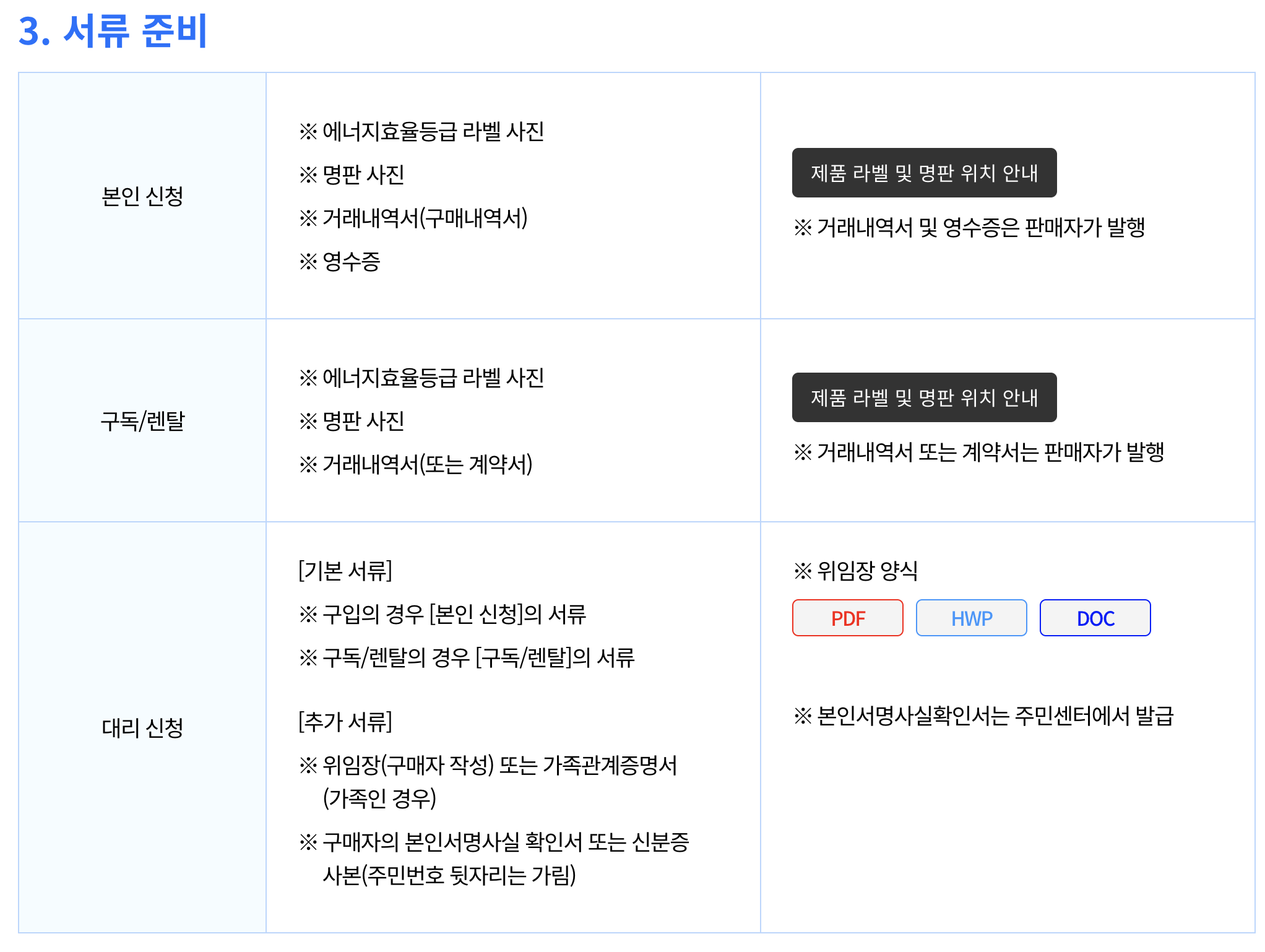 - 설치 및 사용 여부: 미개봉 상태라도 구매완료 증빙이 있으면 신청 가능하지만, 라벨과 명판 사진 촬영을 위해 개봉·설치가 필요한 경우가 많습니다.