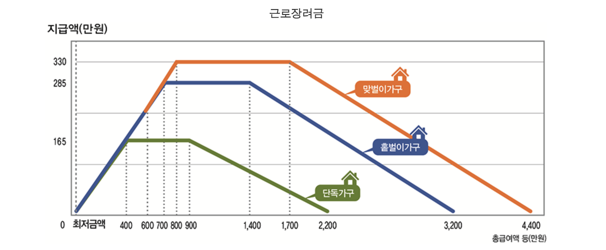 | 홑벌이 가구 | 3,200만 원 미만 | 최대 260만 원 | 배우자 또는 18세 미만 부양자녀가 있는 가구, 맞벌이 아님 |