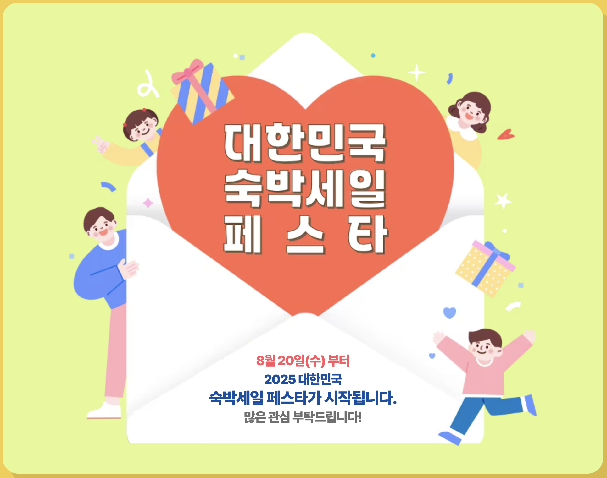 👉 숙박비 부담은 줄이고, 여행의 설렘은 키우며, 지역사회에 힘이 되는 가장 현명한 방법. 그것이 바로 숙박 세일 페스타입니다.