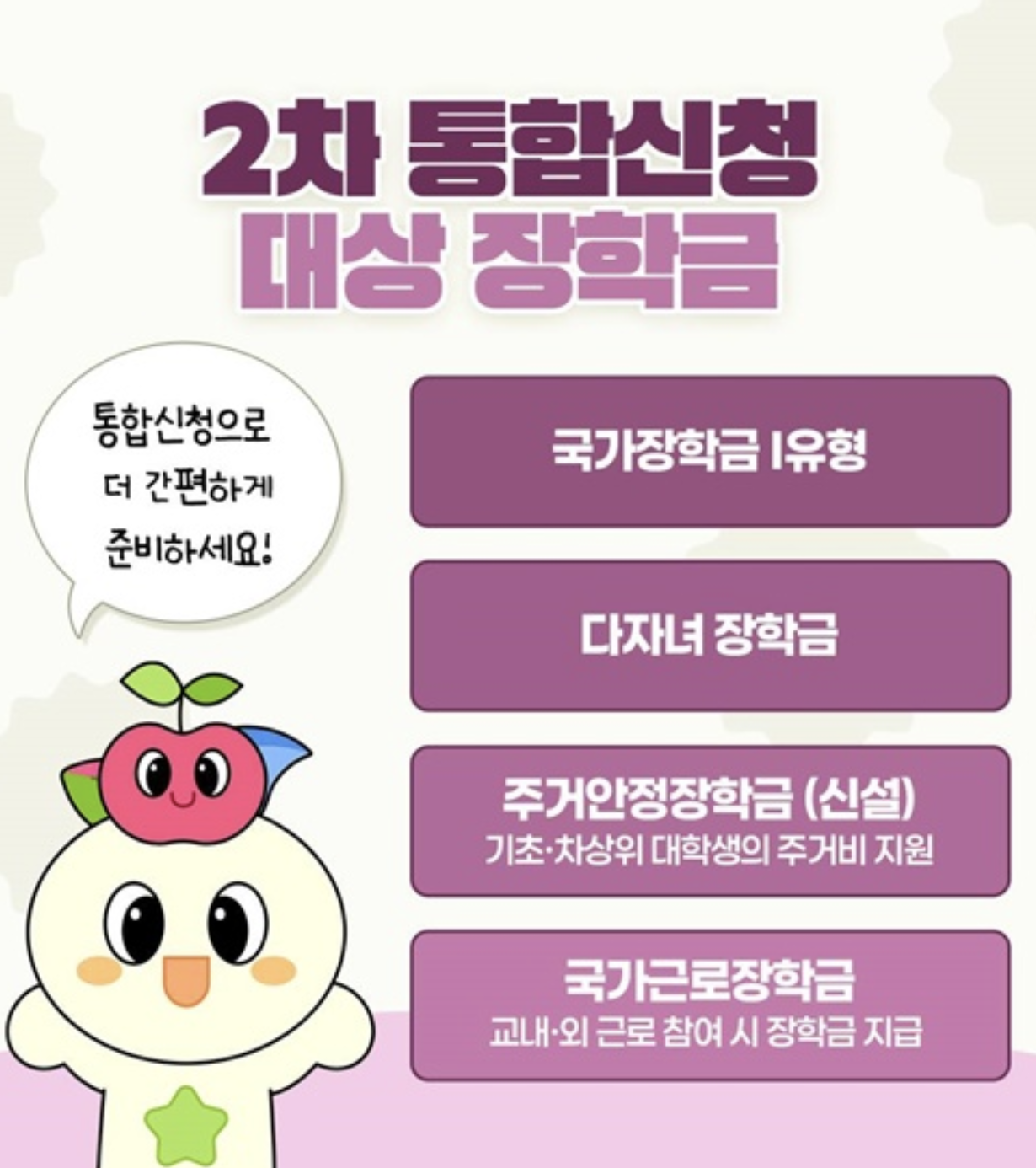 2차 신청을 통해 다음 장학금을 통합 신청할 수 있습니다.