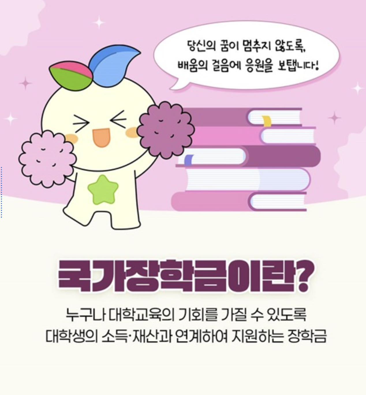 국가장학금은 소득·재산 수준에 따라 등록금의 일부를 지원하여 모든 대학생이 경제적 이유로 학업을 포기하지 않도록 돕는 제도입니다. 다시 말해, 단순한 금전적 보조가 아니라 학생의 교육 기회를 보장하고, 학업의 지속성을 보장하는 국가적 투자라고 할 수 있습니다.