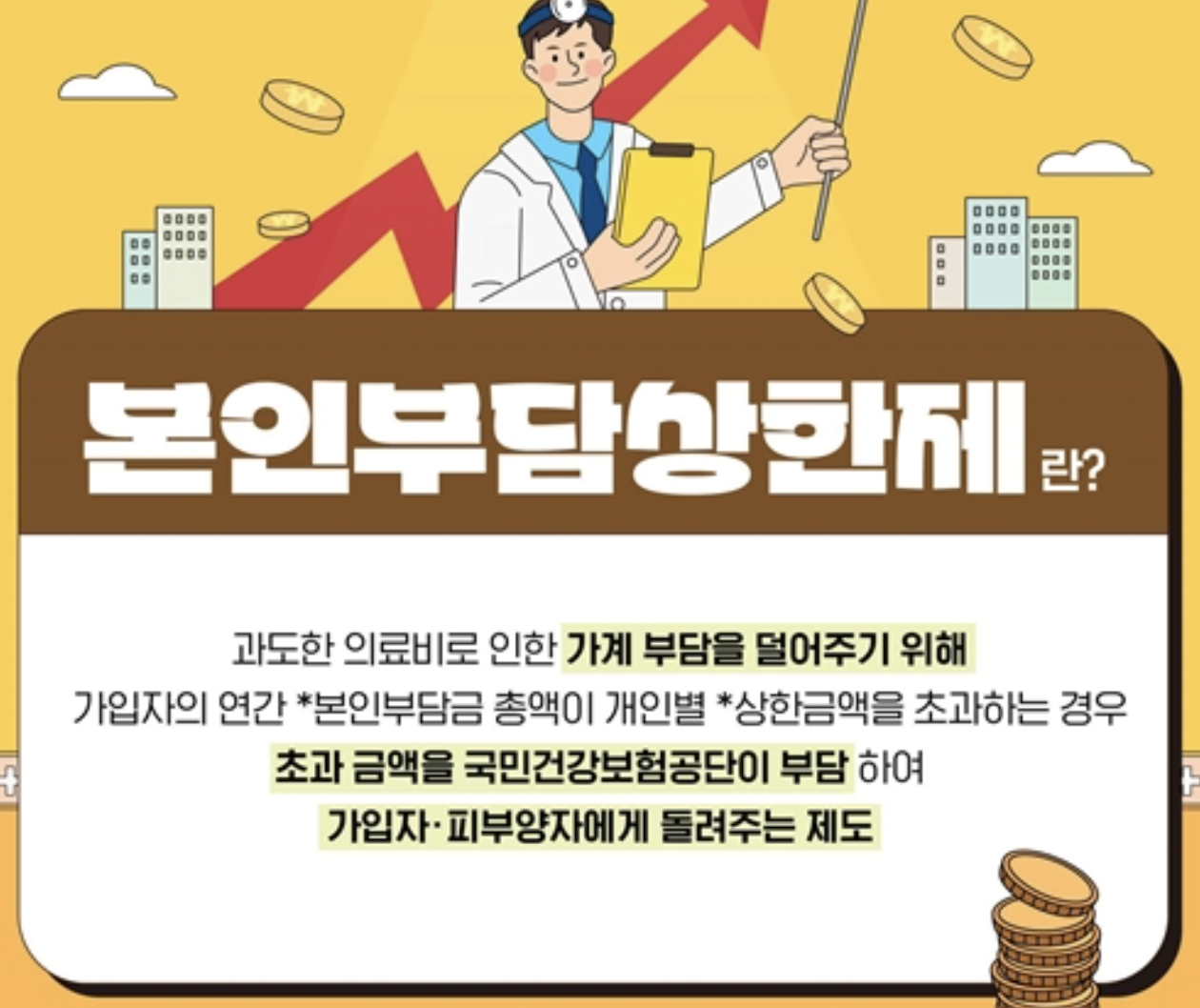 본인부담상한제란 연간 환자가 부담하는 의료비가 일정 금액을 초과하면 초과분을 국민건강보험공단에서 환급해주는 제도입니다. 즉, 소득 수준에 따라 환자가 감당해야 할 최대 의료비 상한선을 정하고, 이를 넘어서는 부분은 국가가 책임지는 구조입니다.