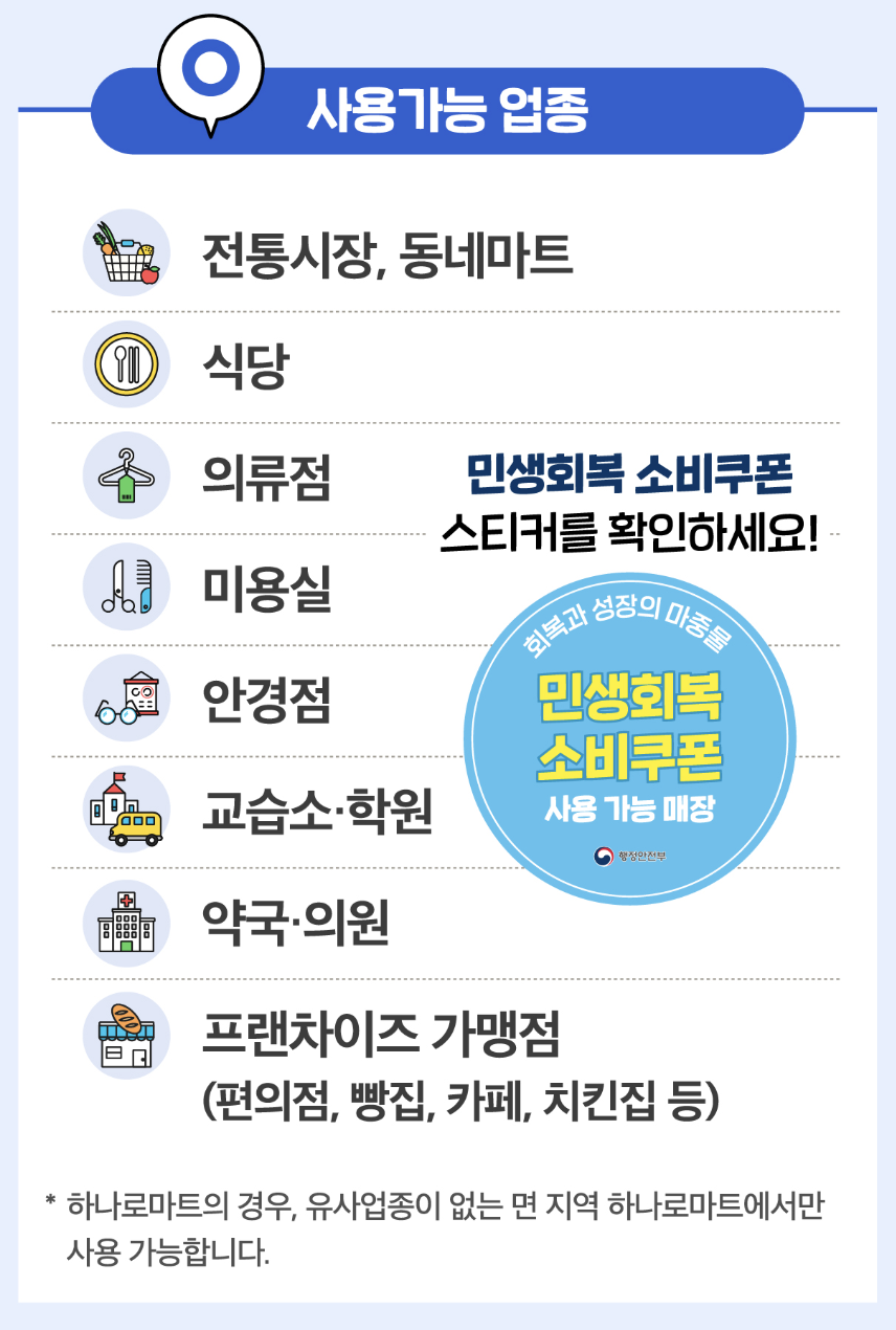 - 지역사랑상품권: 해당 가맹점에서 사용 가능 (예: 전통시장, 동네마트, 학원, 병원, 편의점 등)