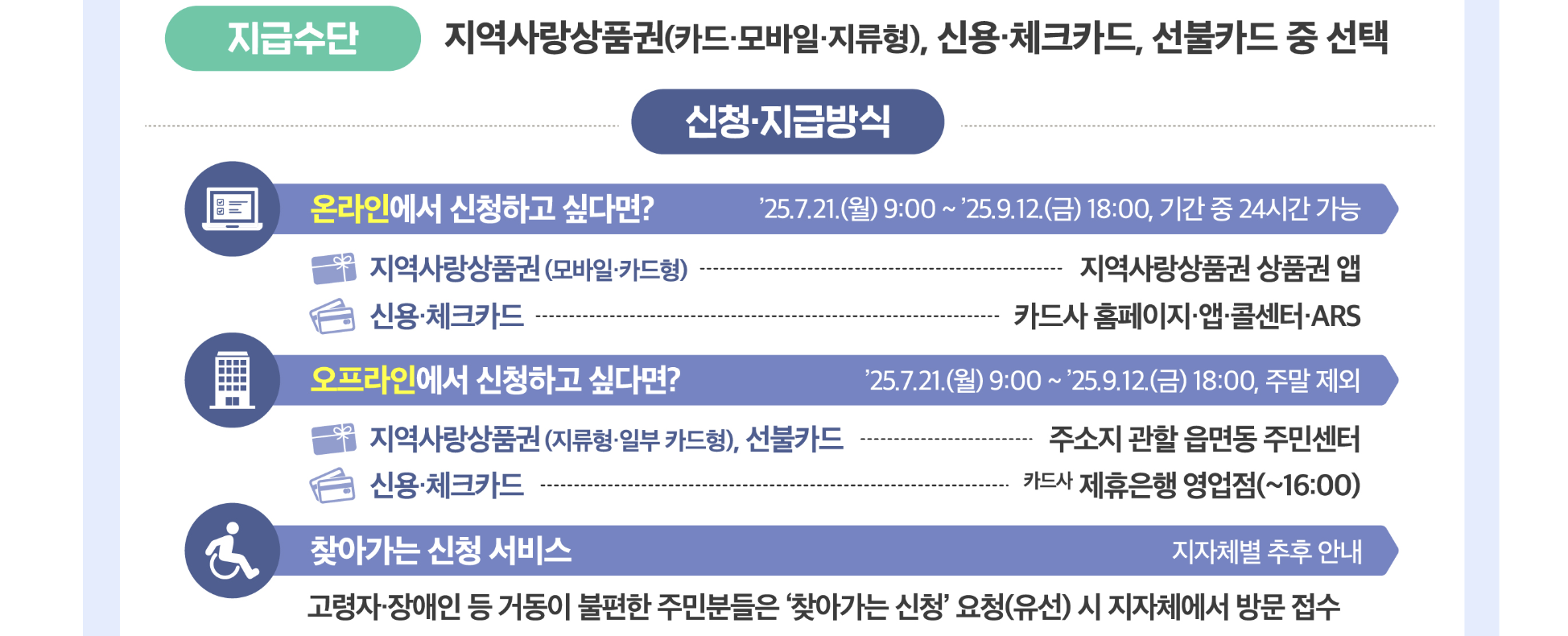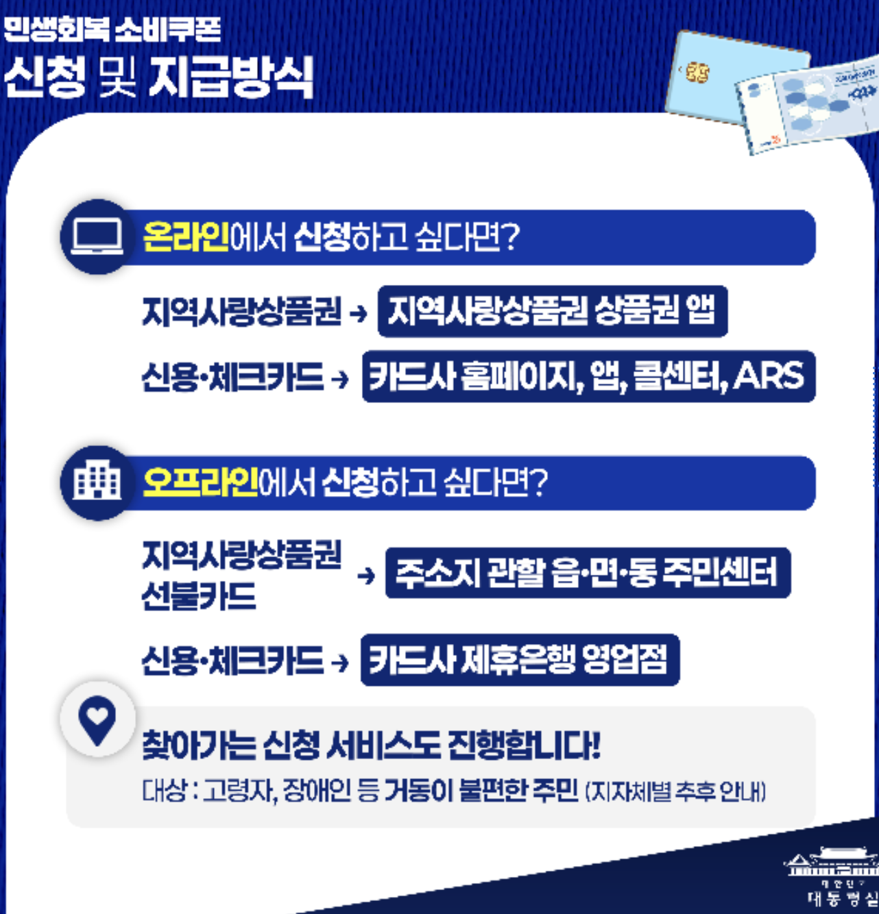 - 온라인: 카드사 웹사이트·앱, 지역사랑상품권 앱, 콜센터, ARS