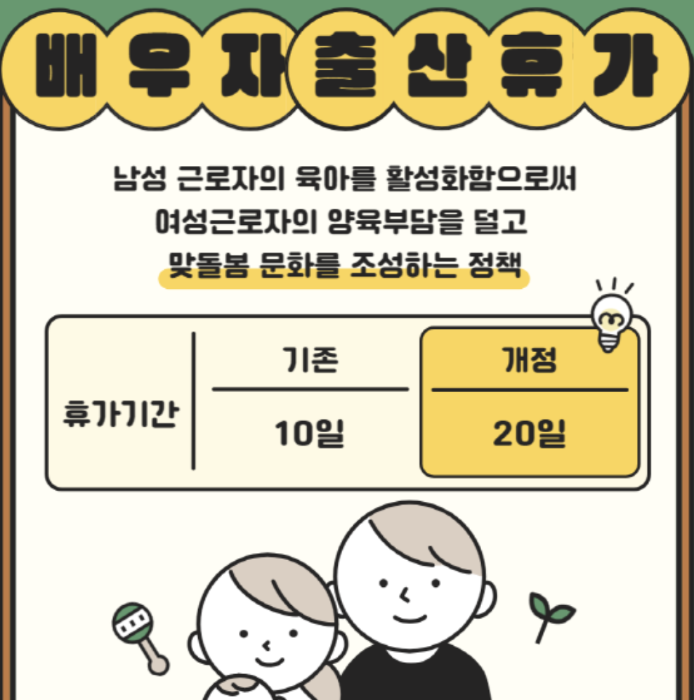 배우자 출산휴가는 단순히 근로자 개인의 권리가 아니라, 가정의 안정과 사회적 저출산 문제 해결을 위한 중요한 제도입니다. 20일간의 휴가와 정부의 지원금은 아버지의 육아 참여를 확대하고, 산모의 회복을 돕는 데 큰 역할을 하고 있습니다.