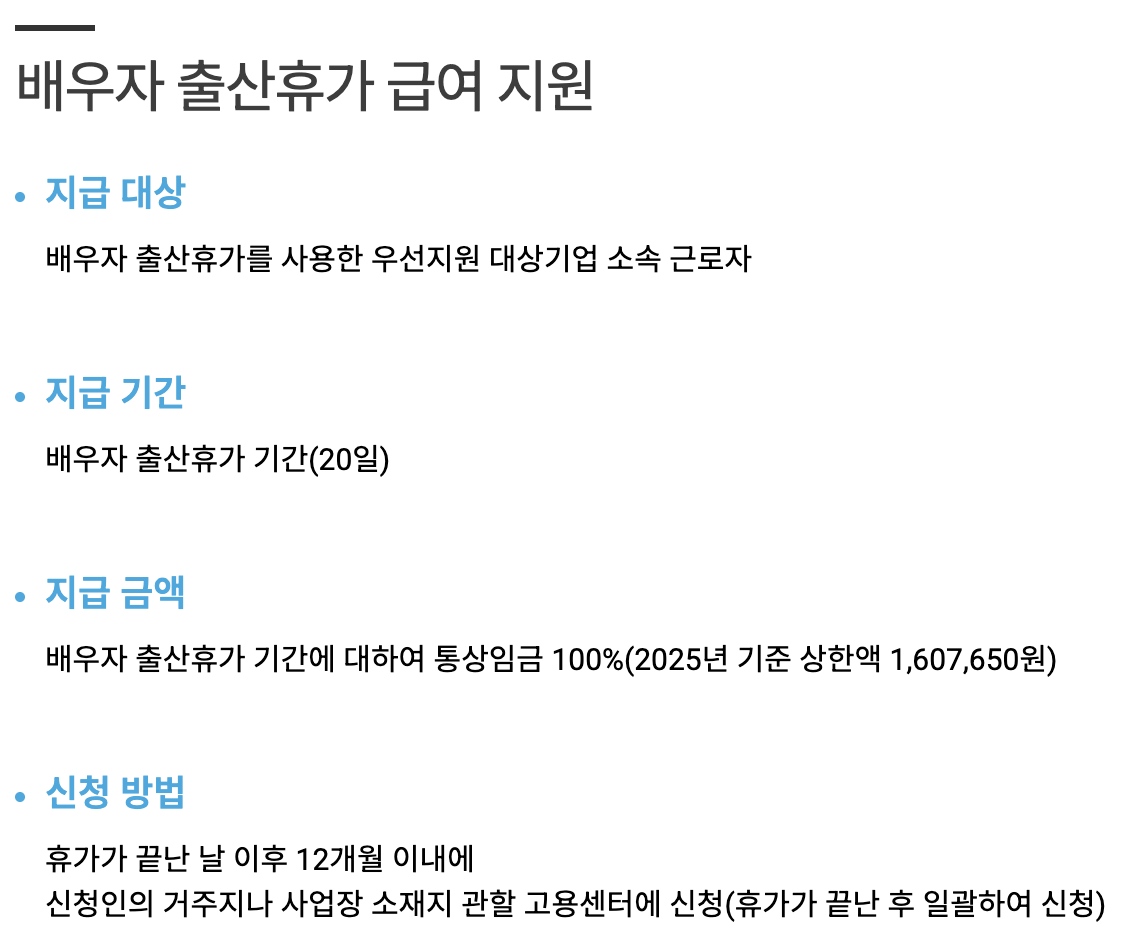 - 배우자 출산휴가 지원금은 부모가 동시에 사용할 수 없고, 근로자가 고용보험 피보험자여야 수급 가능합니다.
