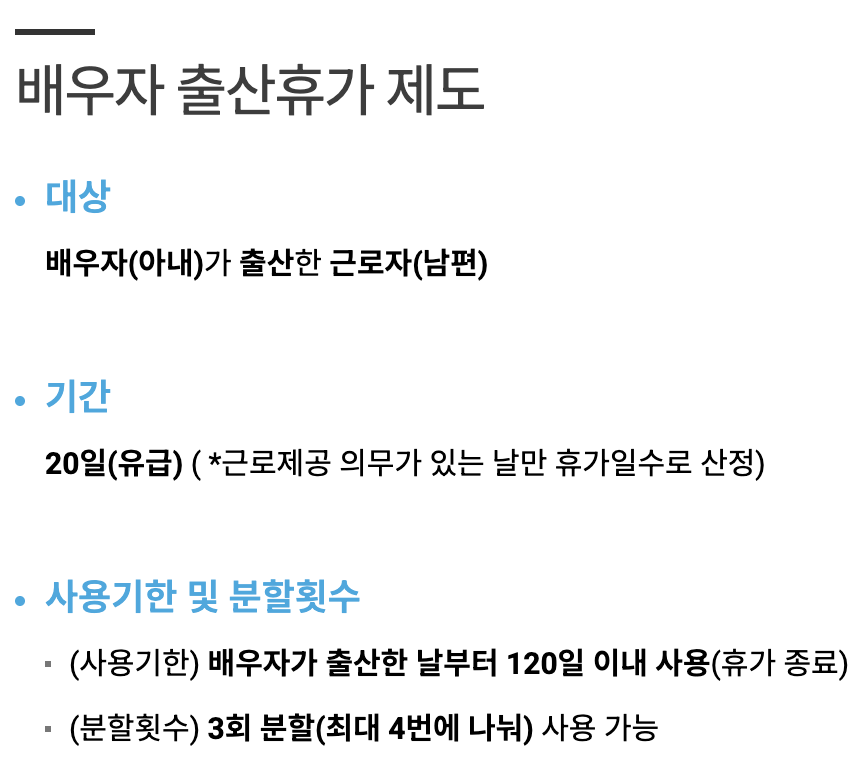 | 대상 | 배우자의 출산 전후 20일 | 만 8세(또는 초등학교 2학년) 이하 자녀 |