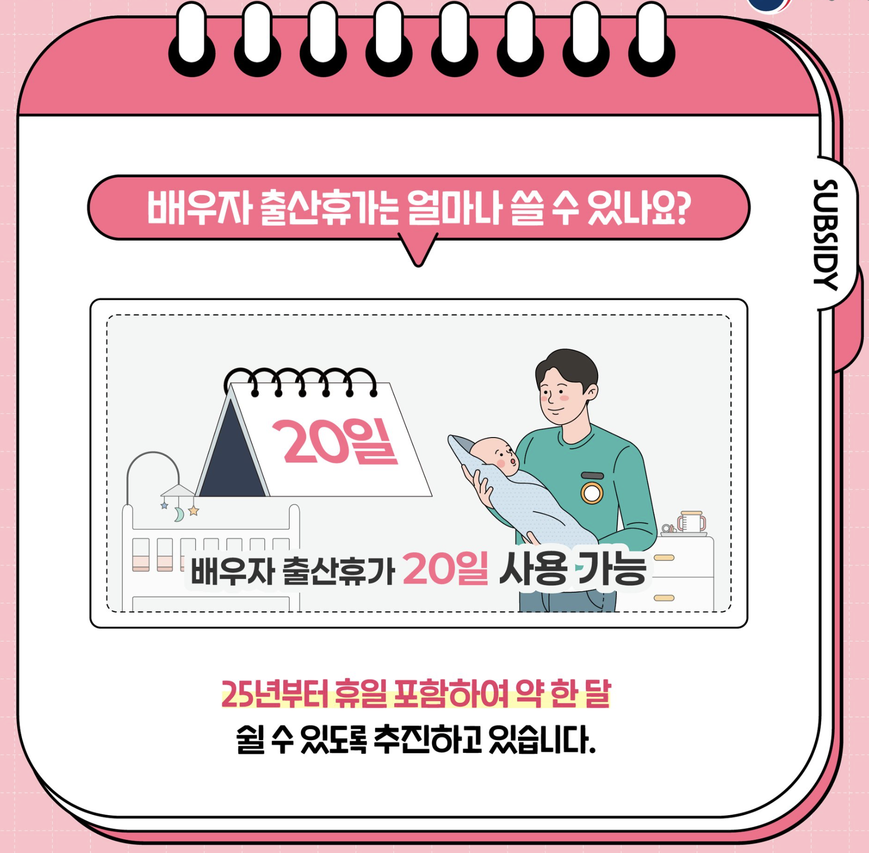 과거에는 5일(그중 3일 유급)만 보장되던 제도가 점진적으로 확대되어 현재는 총 20일을 사용할 수 있도록 개선되었습니다. 이는 OECD 주요국 수준에 가까운 지원으로, 출산 가정의 부담 완화에 큰 의미가 있습니다.