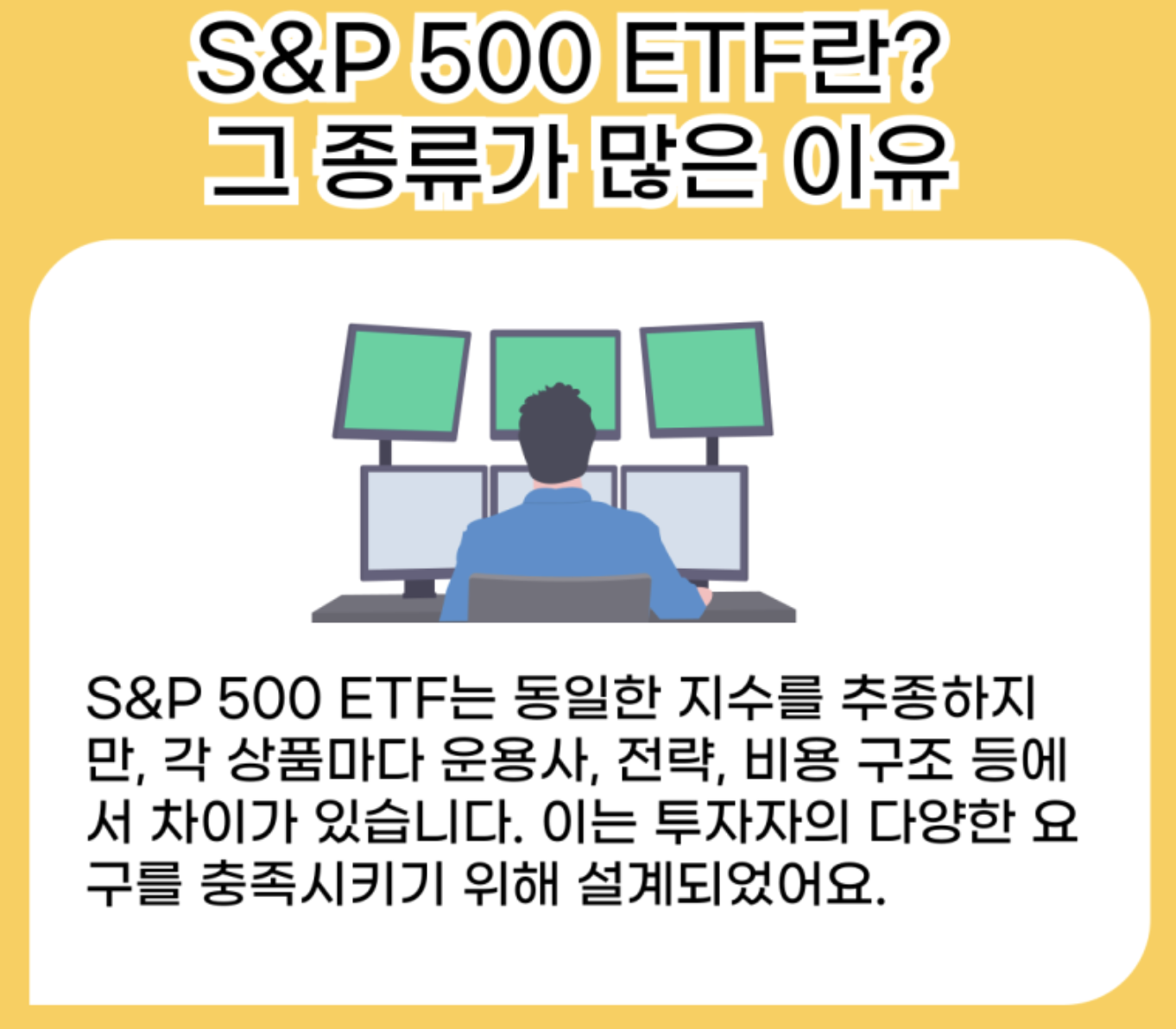 주식 투자에 처음 입문할 때 가장 큰 고민은 어떤 종목에 투자해야 안정적으로 수익을 낼 수 있을까라는 점입니다. 개별 종목 투자는 높은 수익을 얻을 수 있는 기회가 있는 반면, 리스크도 그만큼 크기 때문에 초보 투자자에게는 부담이 될 수 있습니다. 이런 이유로 많은 전문가들이 투자 초보자들에게 추천하는 것이 바로 S&P500 지수를 추종하는 ETF입니다.
