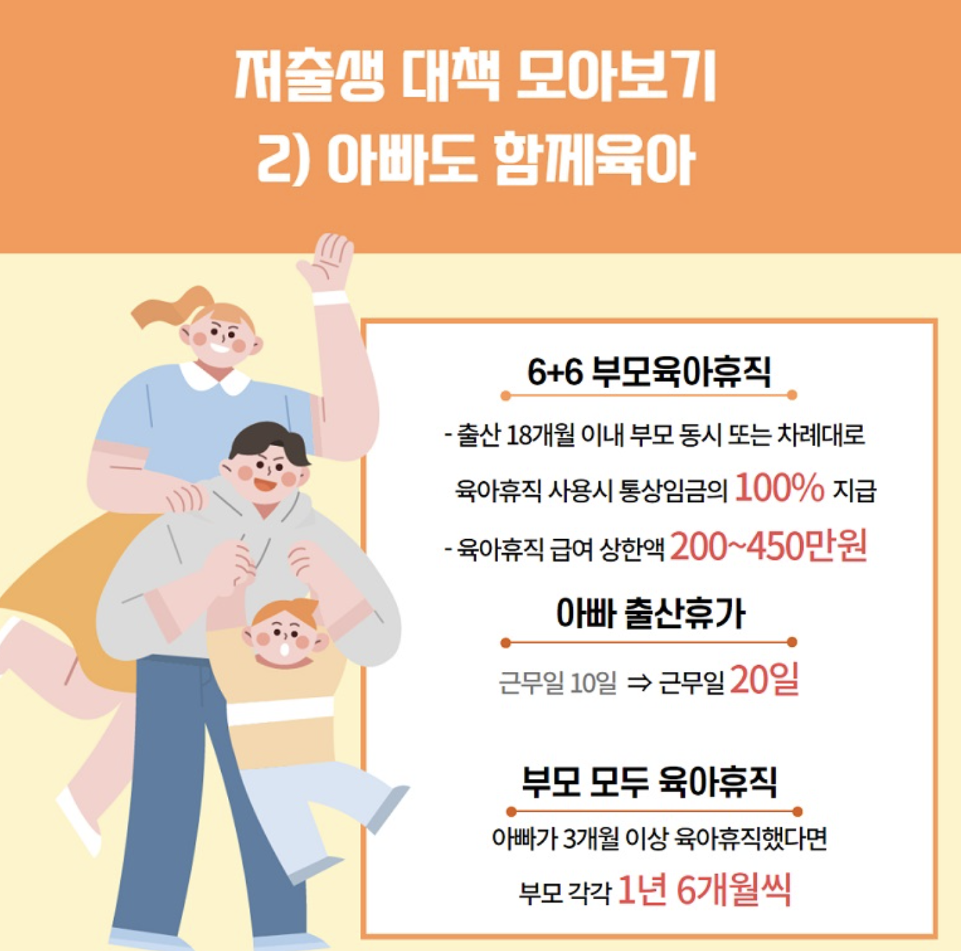 | 제도 적극 활용 | 아빠 보너스제 + 6+6 제도 + 출산휴가(20일) 조합 시 가장 강력한 지원 효과 가능 Two thank papa |