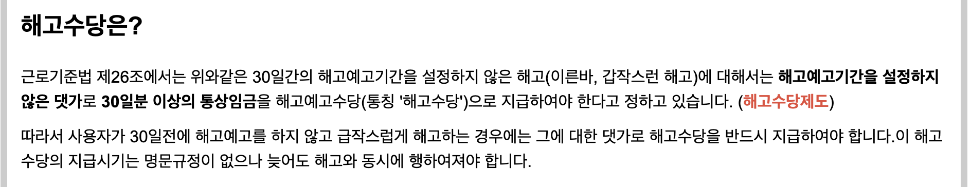 | 지급 시점 | 해고 시, 미리 통보되지 않은 경우 | 퇴직 시점 |
