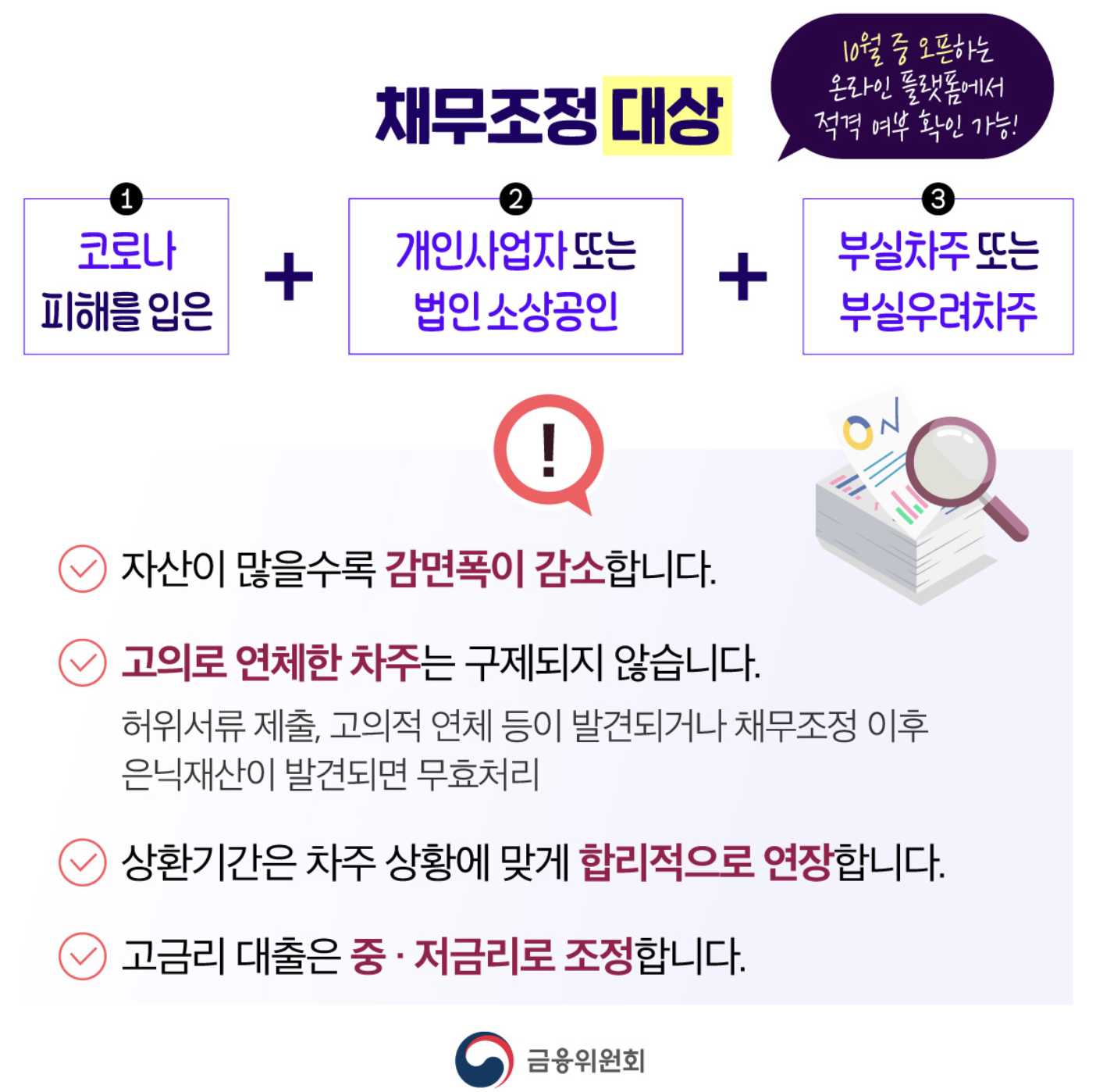 - 모든 채무가 조정되는 것은 아님: 담보대출, 정책자금 일부는 제외될 수 있습니다.