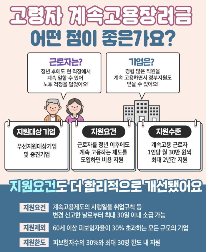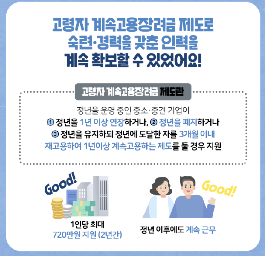 이 제도는 만 60세 이상의 고령 근로자를 계속 고용하는 사업주에게 인건비의 일정 부분을 지원함으로써, 기업의 부담을 줄이고 고령자의 안정적인 고용 유지를 도모하는 것을 목적으로 합니다. 특히 정년 연장이나 정년 폐지를 통해 고령자 고용을 적극적으로 확대하는 기업에 대해서는 더욱 두터운 지원을 제공하고 있습니다.