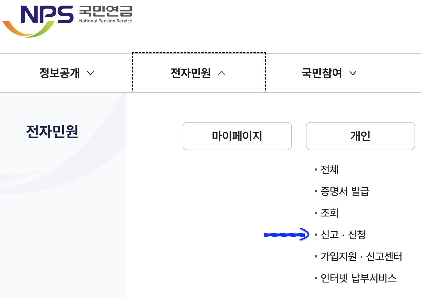 국민연금공단 홈페이지 → 민원서비스 → 연금 신청