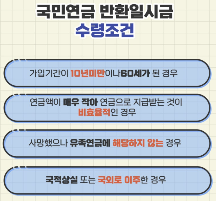 이러한 경우 “국민연금 해지”라는 표현을 쓰기도 하지만, 정확히 말하면 일시금 수령 조건이 충족되었을 때 반환일시금 형태로 환급받는 것입니다.