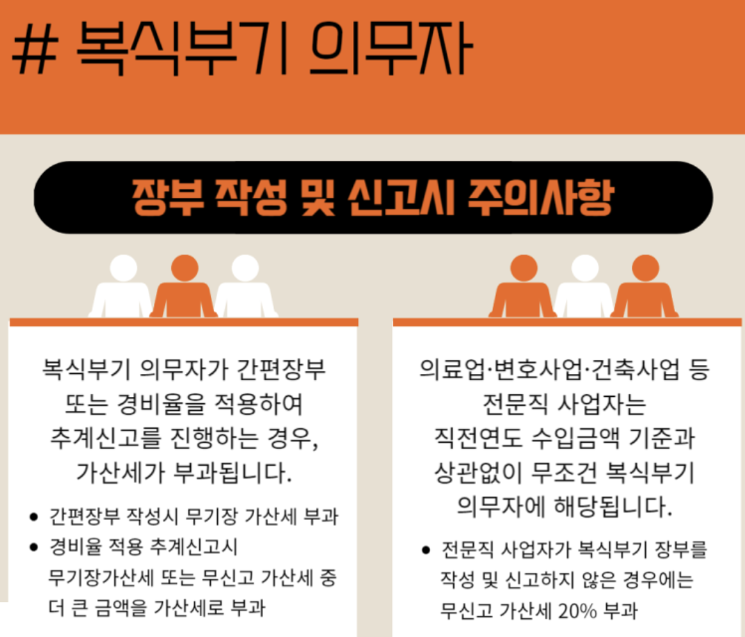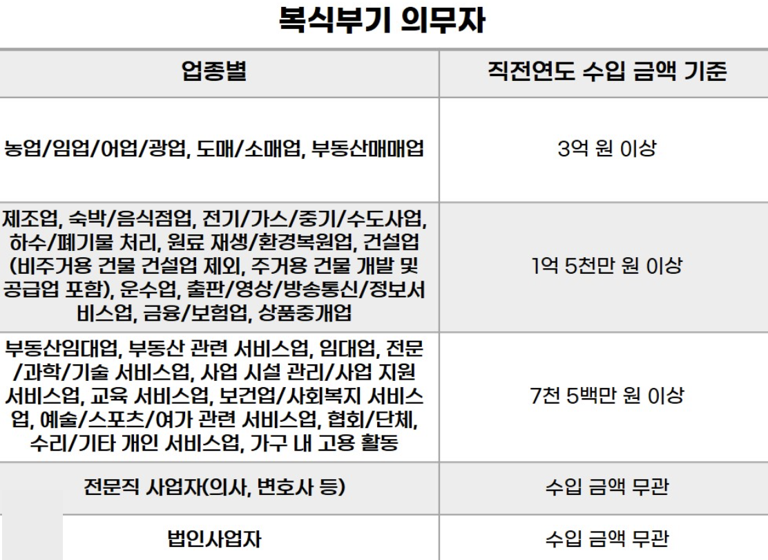 - 전문직 사업자: 직전년도 수입금액 규모와 관계없이 복식부기의무자에 해당됩니다.