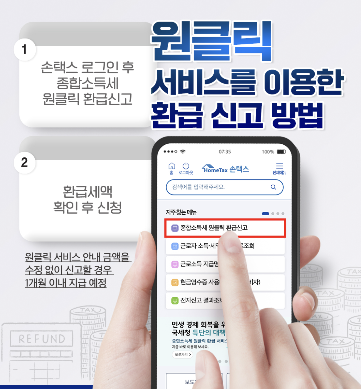 - ‘환급금 조회’ 또는 ‘원클릭 환급’ 메뉴 클릭