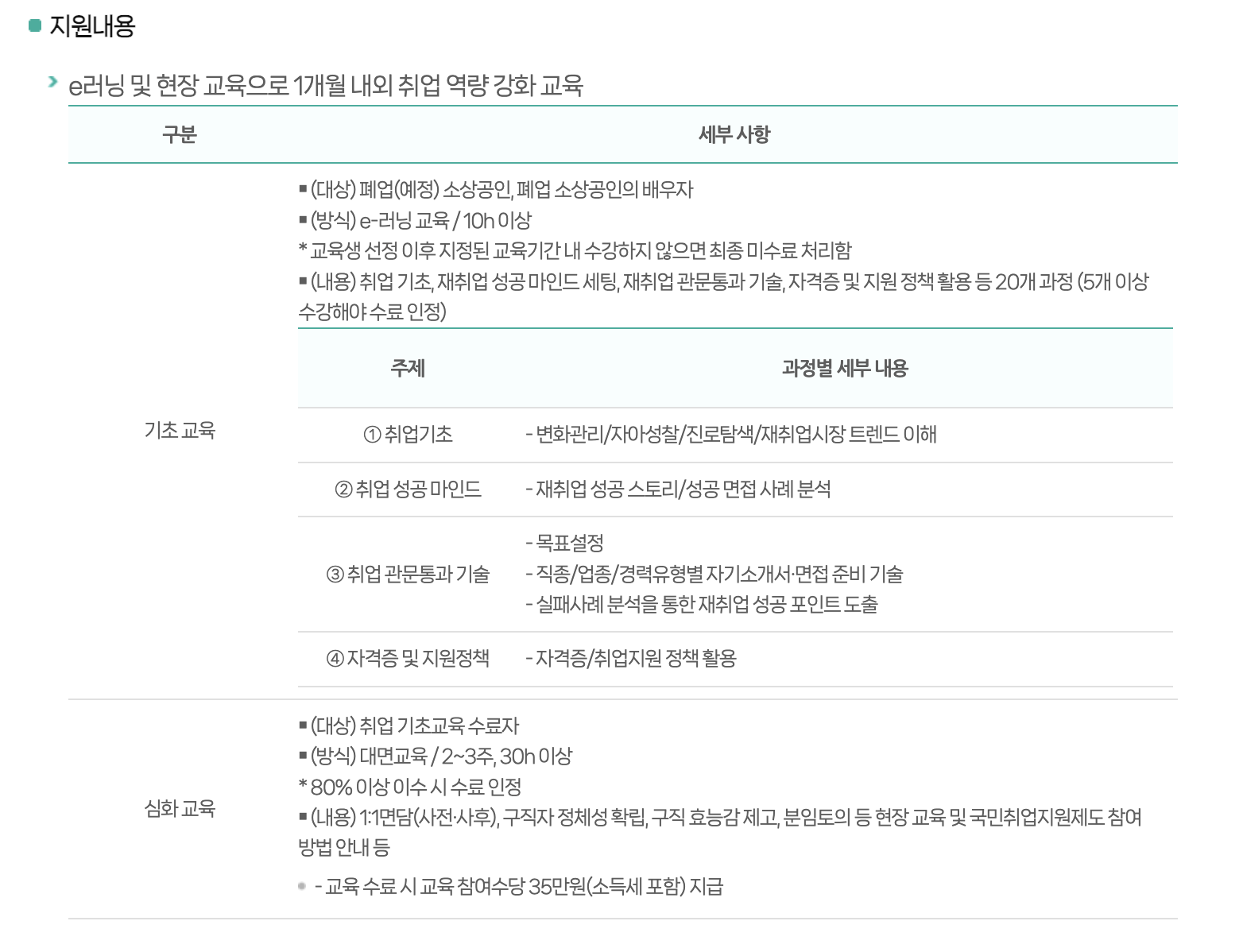 | 교육 유형 | - 기본 경영교육 - 창업 준비과정 - 취업 전환 교육 등 |