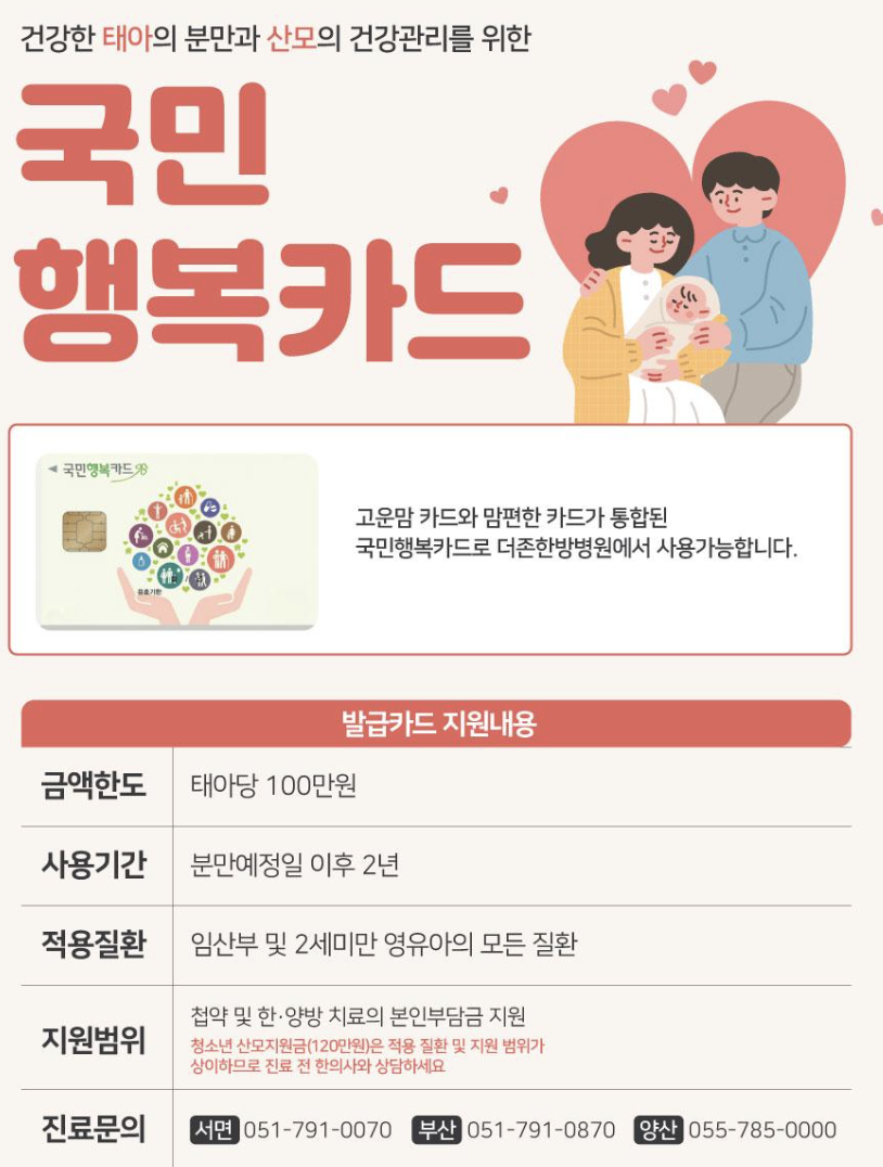 국민행복카드는 임산부, 영유아 부모, 난임 시술 대상자 등에게 정부에서 지원하는 바우처(건강보험공단, 보건복지부 등)를 하나의 카드로 통합 지원하는 복지카드입니다. 사용자는 해당 카드에 바우처를 등록해 병원, 약국, 산후조리원 등에서 사용할 수 있습니다. 또한 제휴 카드사에서 제공하는 추가 혜택(할인, 포인트 적립 등)도 누릴 수 있어 실용성이 높습니다.
