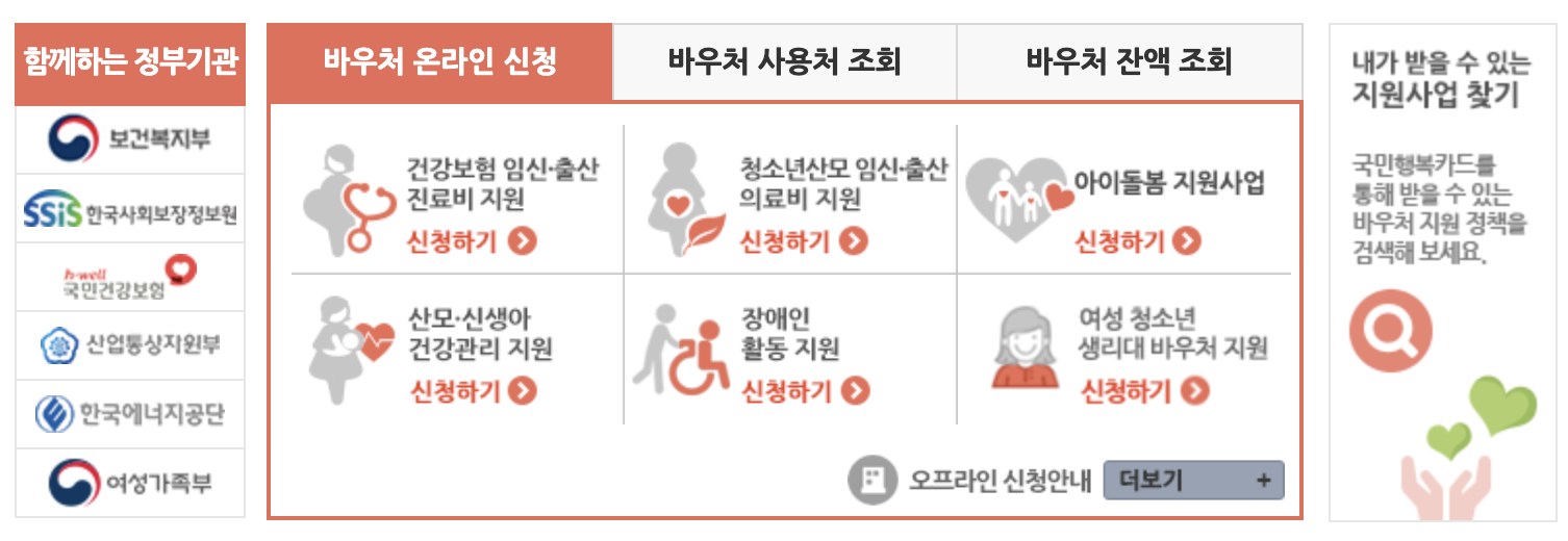 국민행복카드는 단순한 카드가 아니라 바우처를 등록해 사용해야 하는 방식입니다. 상황에 따라 아래와 같은 바우처를 등록할 수 있습니다.