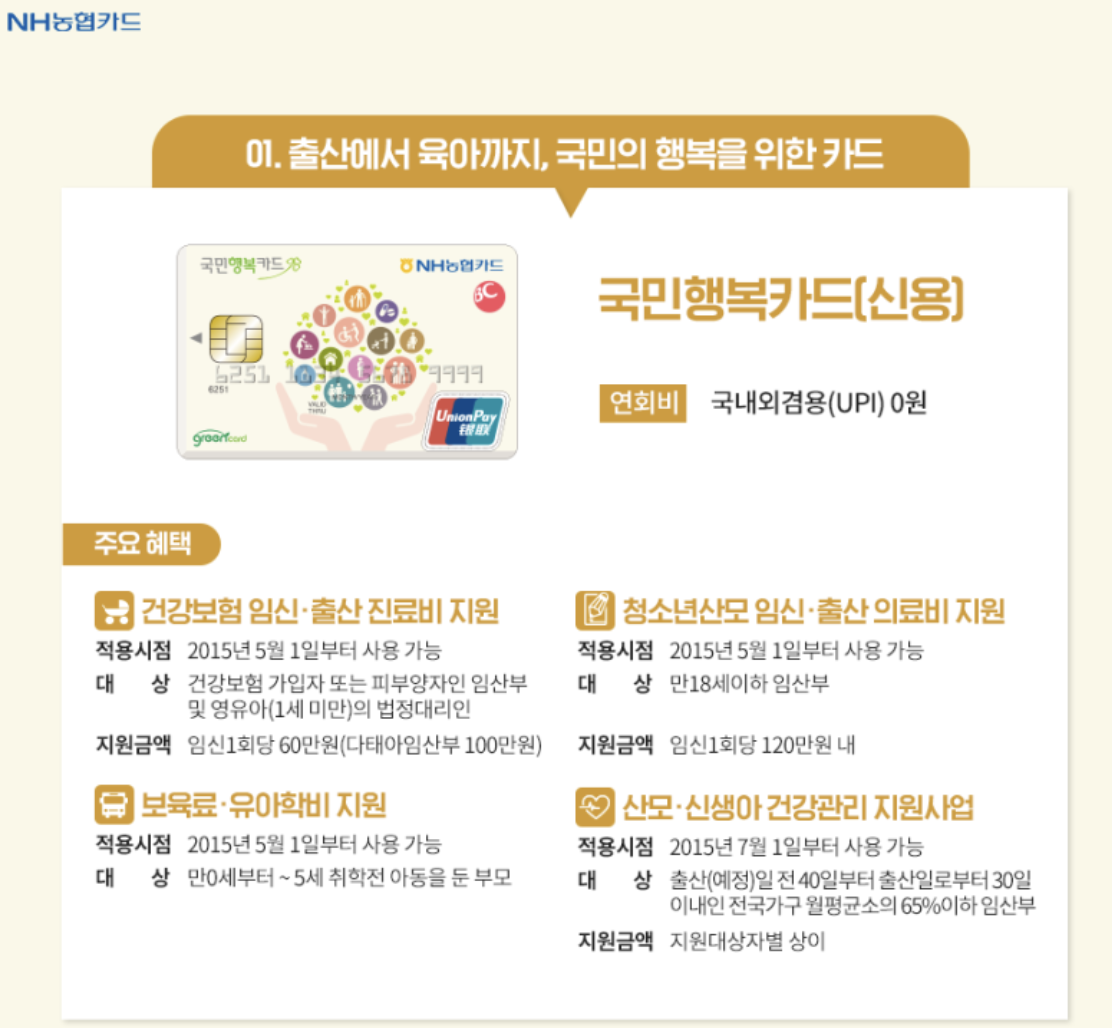 | NH농협카드 | NH농협 국민행복카드 신청 | 농어촌 지역 혜택 강점, 제휴 병원 연계 |