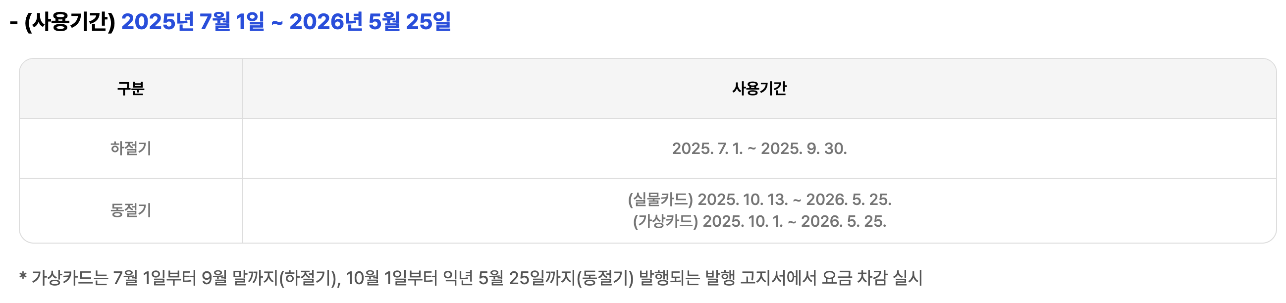 바우처는 연중 사용할 수 있는 것이 아니라, 여름과 겨울 지정된 사용 기간 내에서만 유효합니다. 사용하지 않은 잔액은 다음 해로 이월되지 않고 사라지므로, 기한 내 사용은 필수입니다. - 거주지 이사 시 반드시 정보 갱신 필요