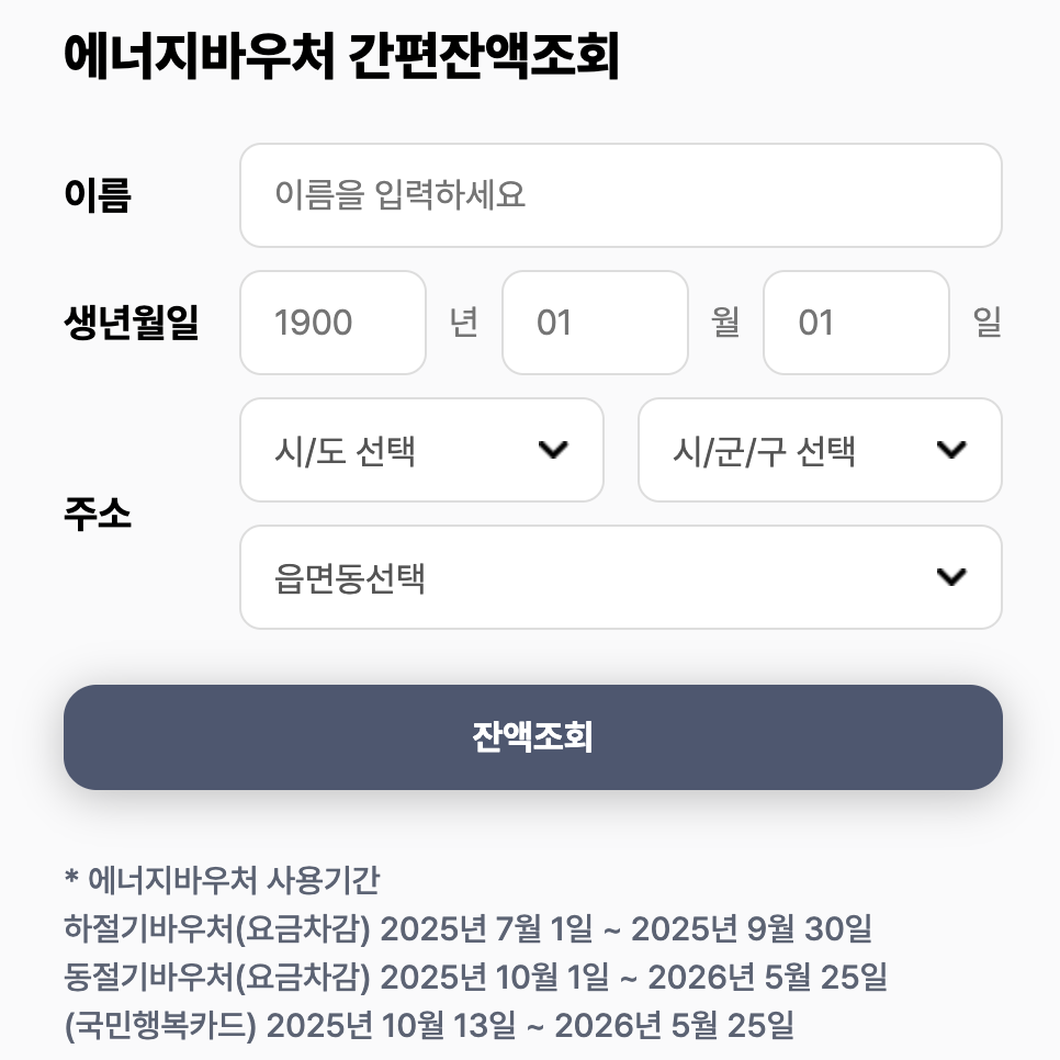 - 카드 사용처는 지자체, 에너지 바우처 홈페이지, 주민센터를 통해 사전 확인이 가능하며, 실시간 잔액 확인도 가능합니다.