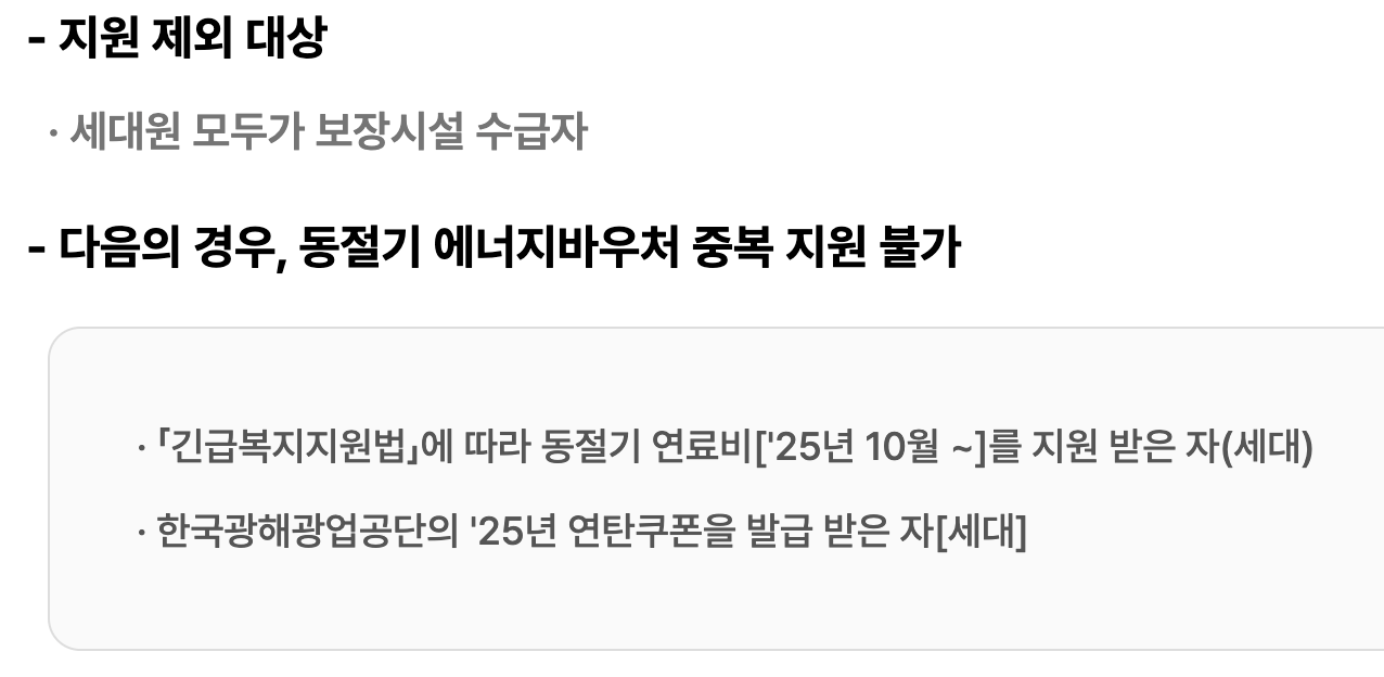 일부 지자체나 기관에서 유사한 에너지 지원을 받을 경우, 에너지 바우처와 중복 수급이 제한될 수 있습니다. 기초생활수급자라 하더라도 기타 특별 지원사업 대상인 경우는 제외될 수 있으니, 반드시 사전 확인이 필요합니다.