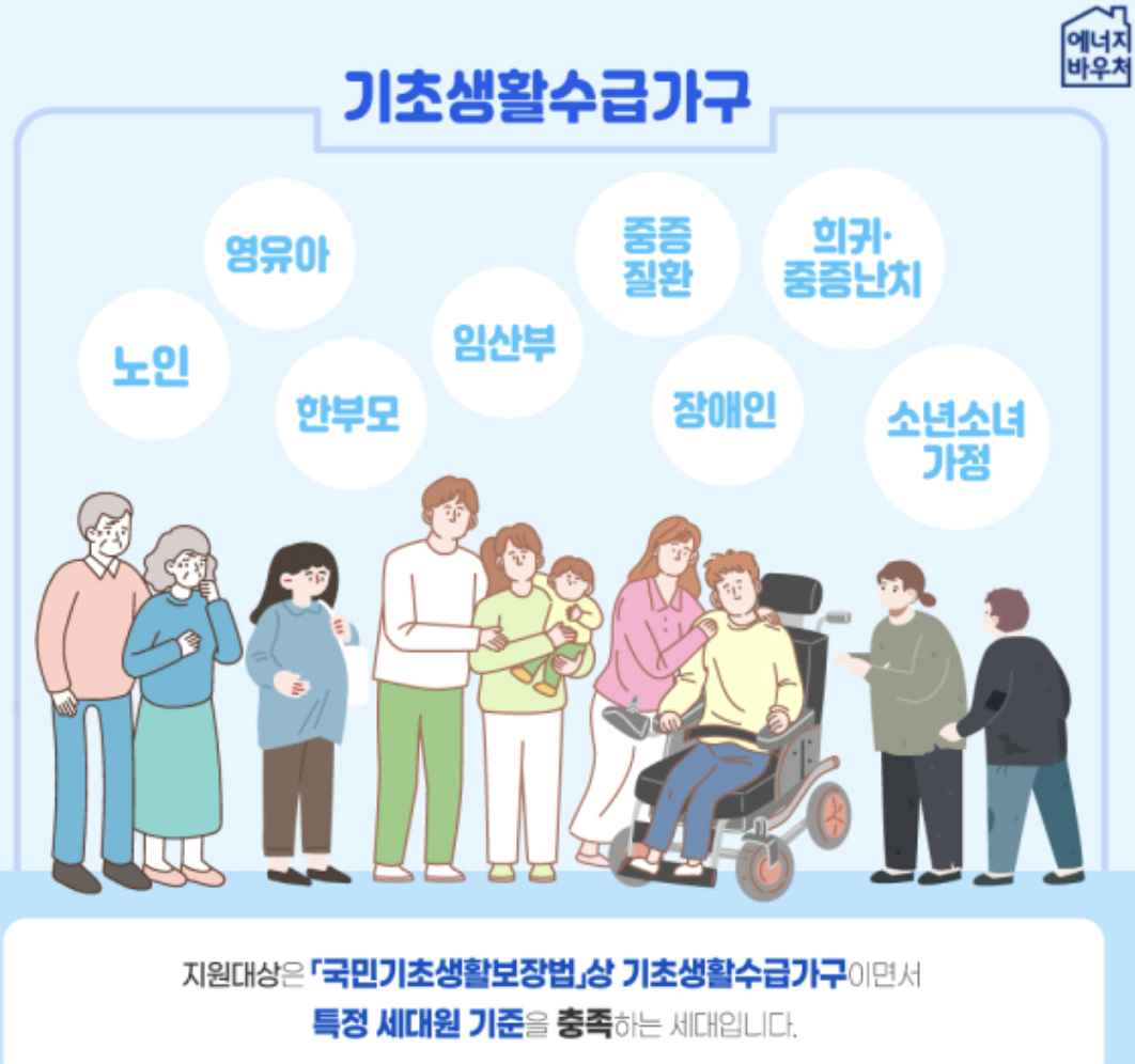 에너지 바우처는 기초생활수급자 중 생계급여 또는 의료급여 수급자로, 아래 요건 중 하나라도 충족하는 가구에 해당합니다: