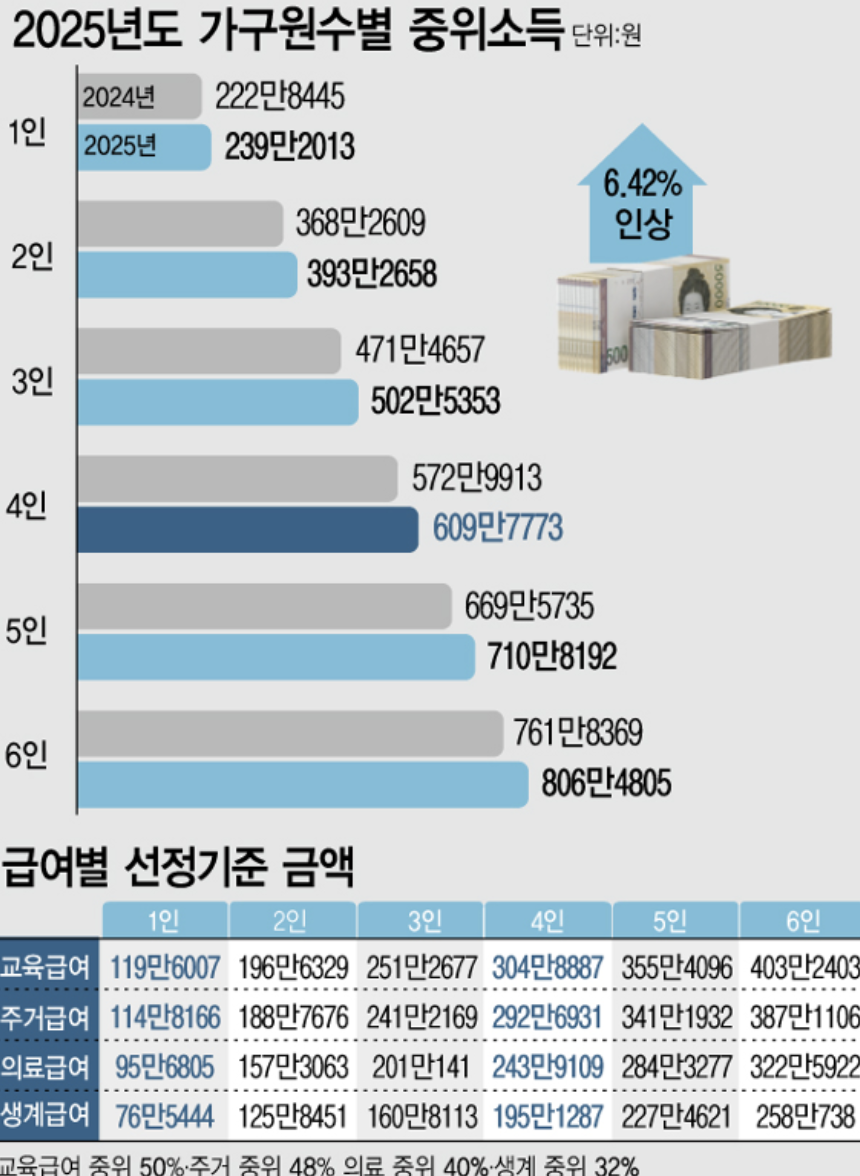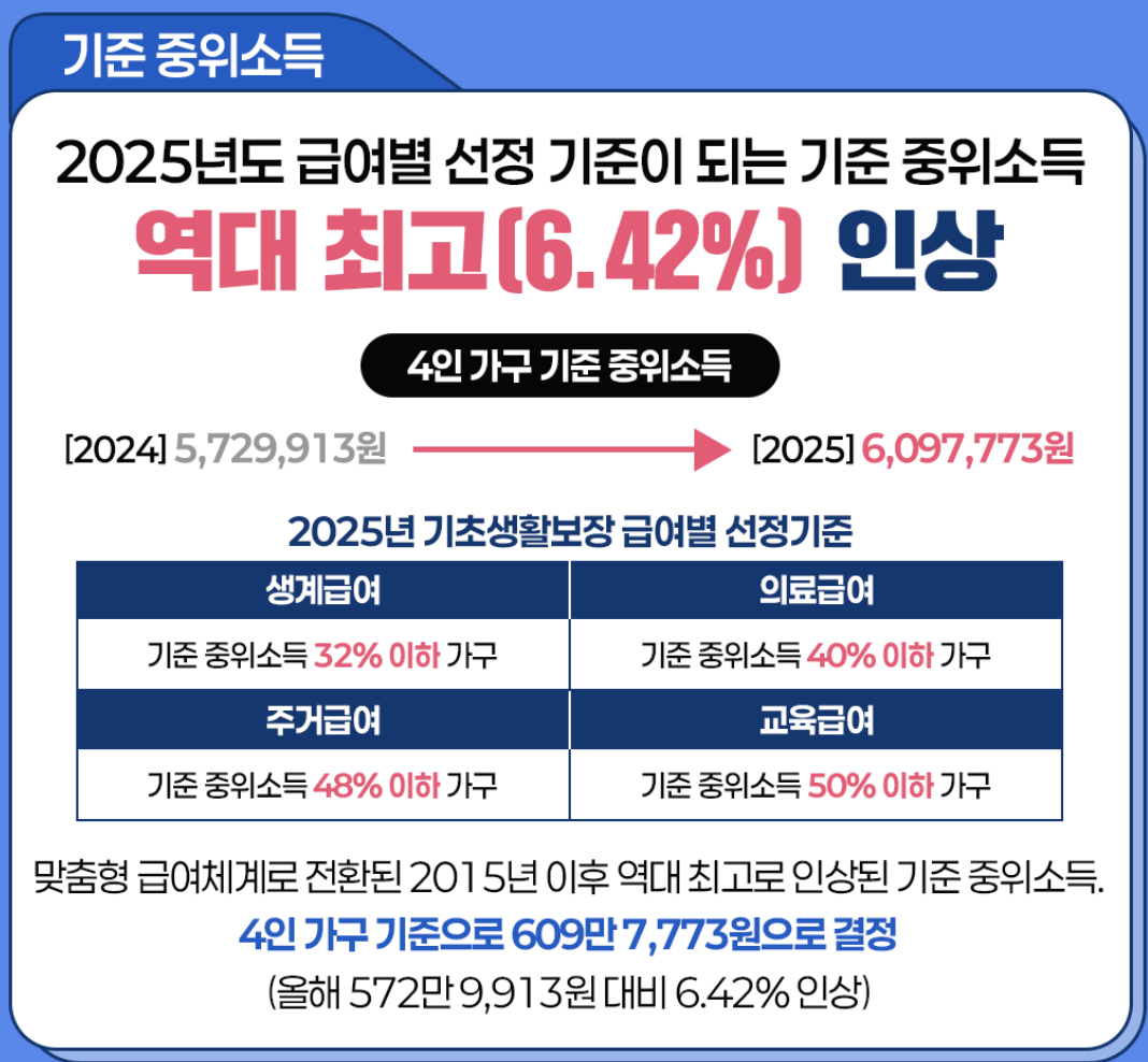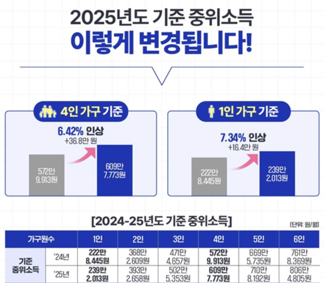 2025년 기준 중위소득(가구 평균 소득의 중앙값)을 기준으로 일정 비율 이하일 경우 대상이 됩니다.