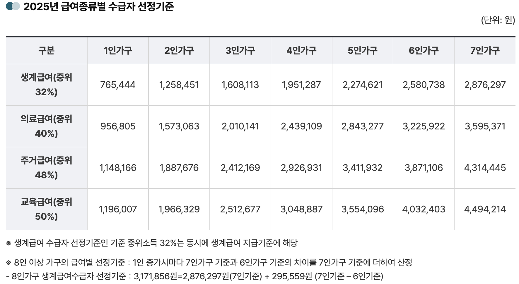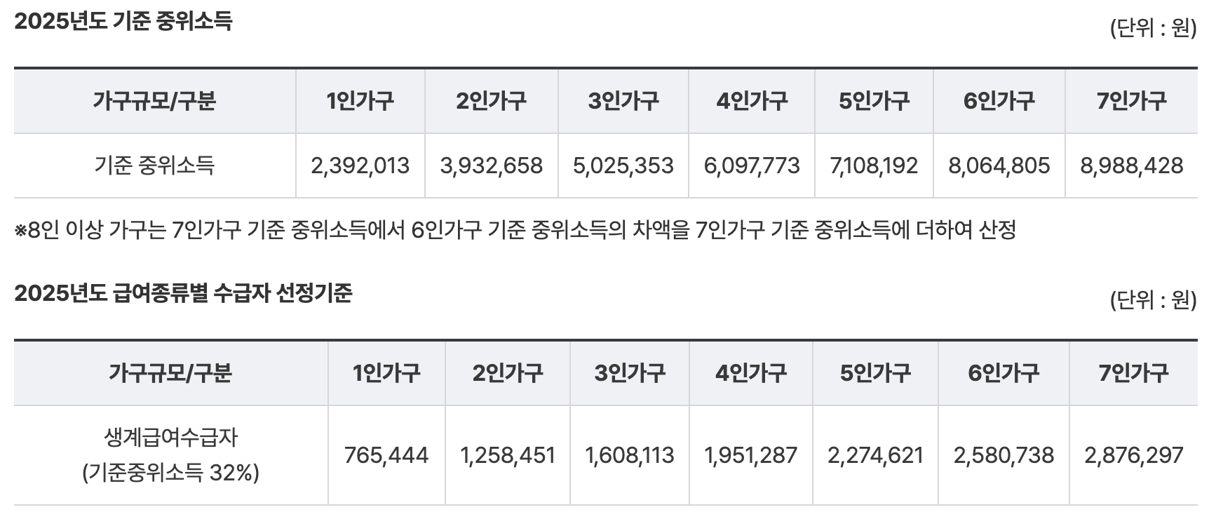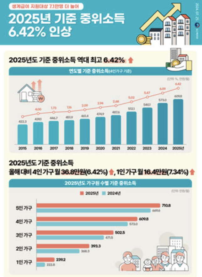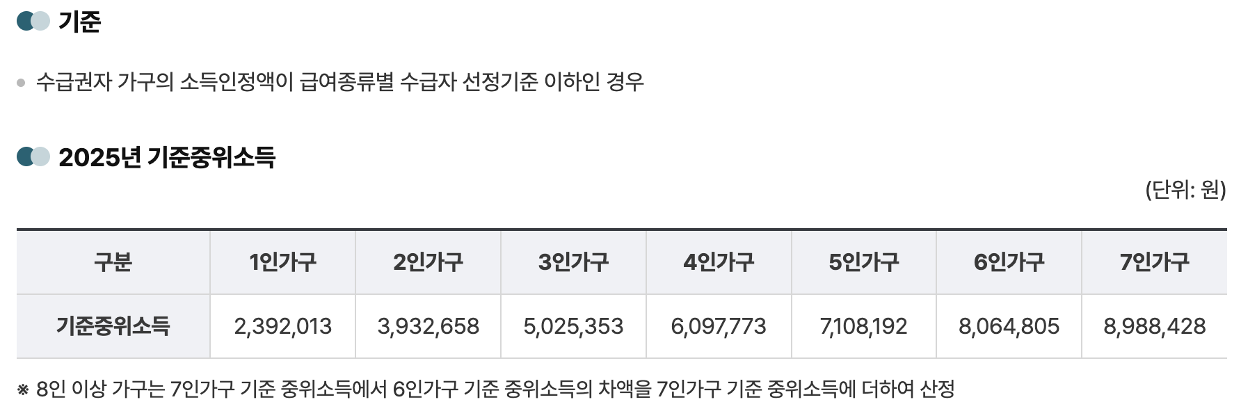 2025년 기준 중위소득(가구 평균 소득의 중앙값)을 기준으로 일정 비율 이하일 경우 대상이 됩니다.