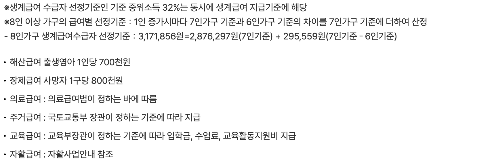 - 생계급여: 기준 중위소득의 30% 이하