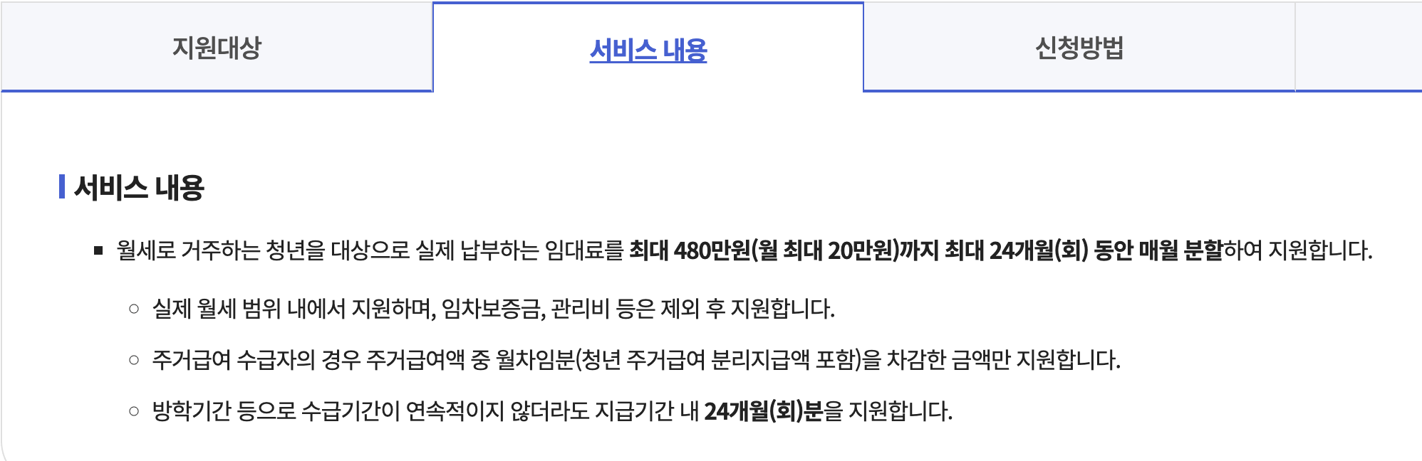 - 지원형태: 월세 계좌입금 (계좌 자동이체 등 형태로 지급)