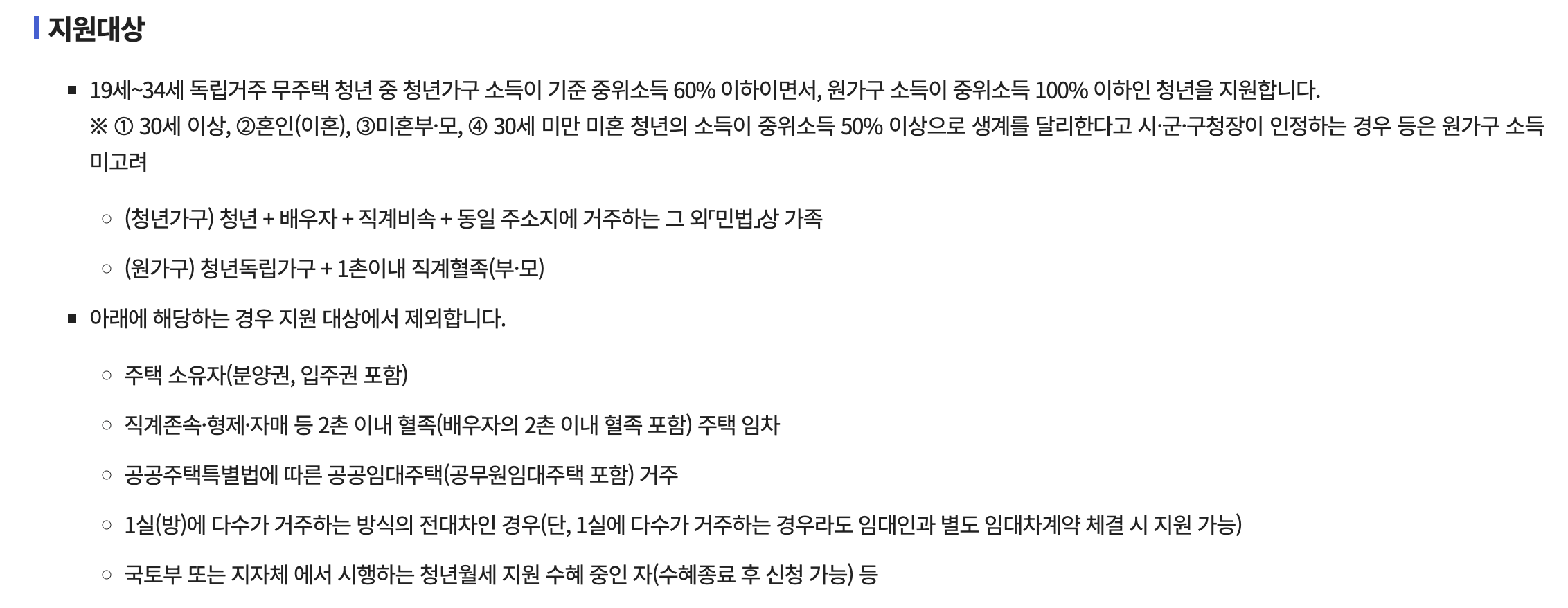 - 소득기준: 청년 본인 기준 중위소득 60% 이하, 원가구 기준 중위소득 100% 이하
