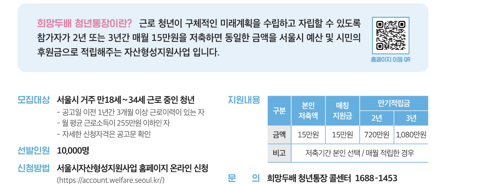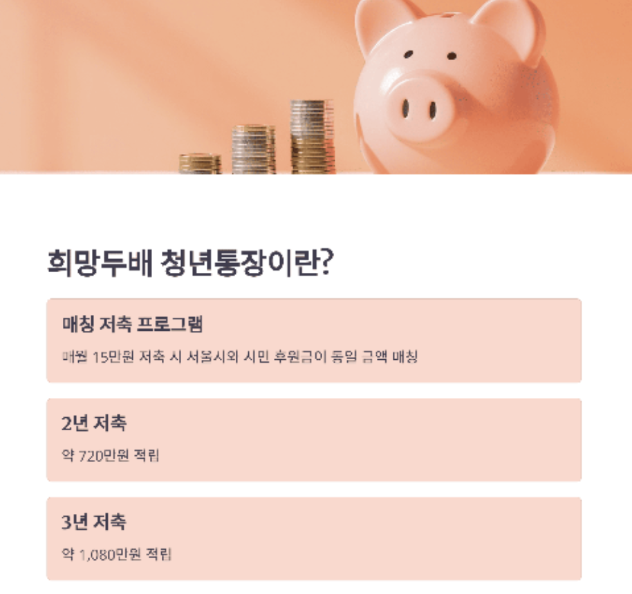 청년이 매달 일정 금액을 저축하면 서울시가 동일 금액을 매칭하여 2배로 적립해주는 방식으로, 학자금 상환, 주거자금, 창업, 결혼 등 미래 준비에 큰 도움이 됩니다.
