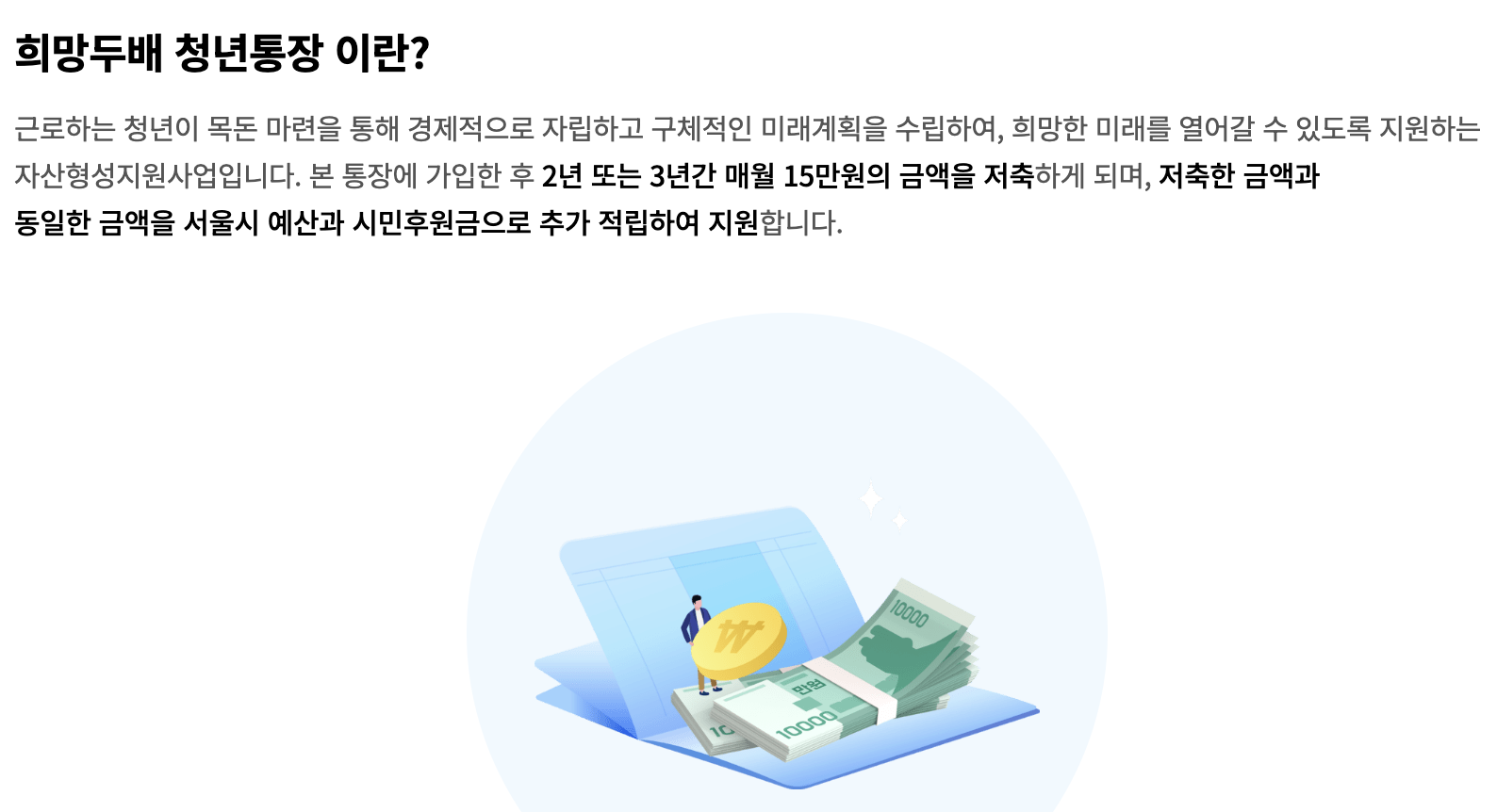 희망두배 청년통장은 단순한 예금상품이 아닌, 서울시가 청년의 저축액만큼 동일한 금액을 추가 적립해주는 자산형성지원제도입니다. 신청자가 매달 10만 원 또는 15만 원을 저축하면, 서울시가 해당 금액을 매칭하여 2배로 적립해주기 때문에, 만기 시 상당한 금액을 모을 수 있습니다.