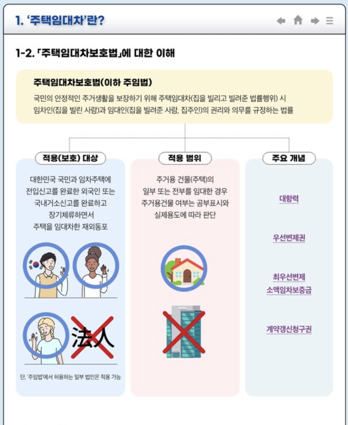 | 주요 보호 | 계약갱신청구권, 전입신고 시 대항력, 보증금 우선변제권 등 |