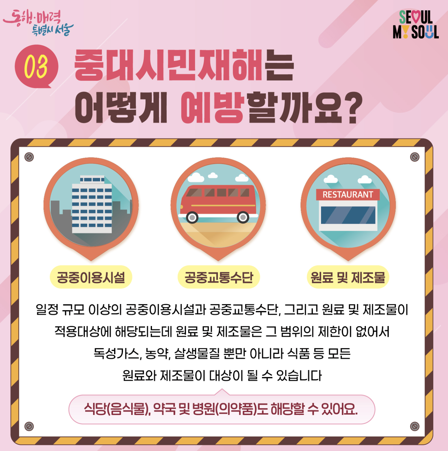 또한, 중대시민재해는 다음과 같은 시설이나 서비스 운영 주체에게 적용됩니다: