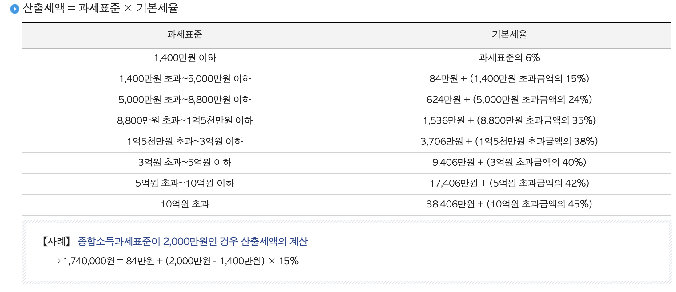 - 과세표준: 총소득에서 기본공제, 인적공제 등을 차감한 금액입니다.