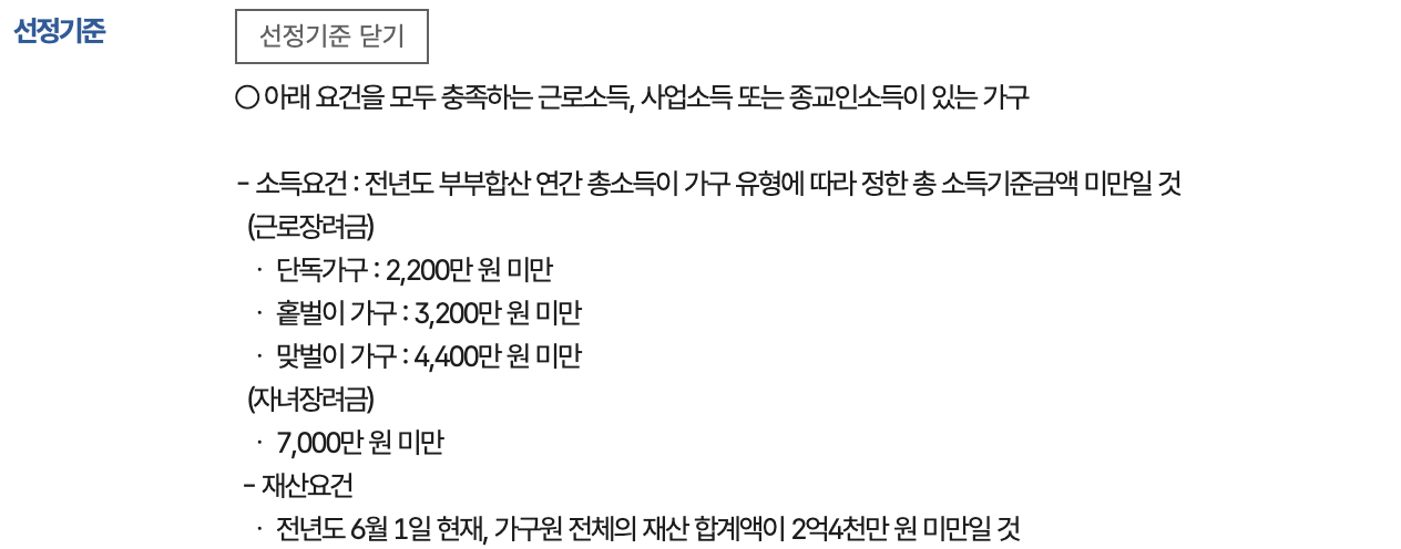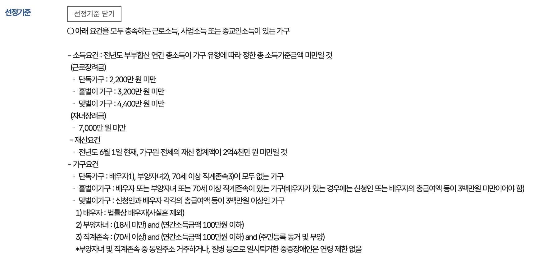 | 단독 가구 | 2,200만 원 미만 | 최대 150만 원 | 만 30세 이상 단독 거주자(단, 18세 미만 부양자녀 있는 경우 나이 제한 없음) |