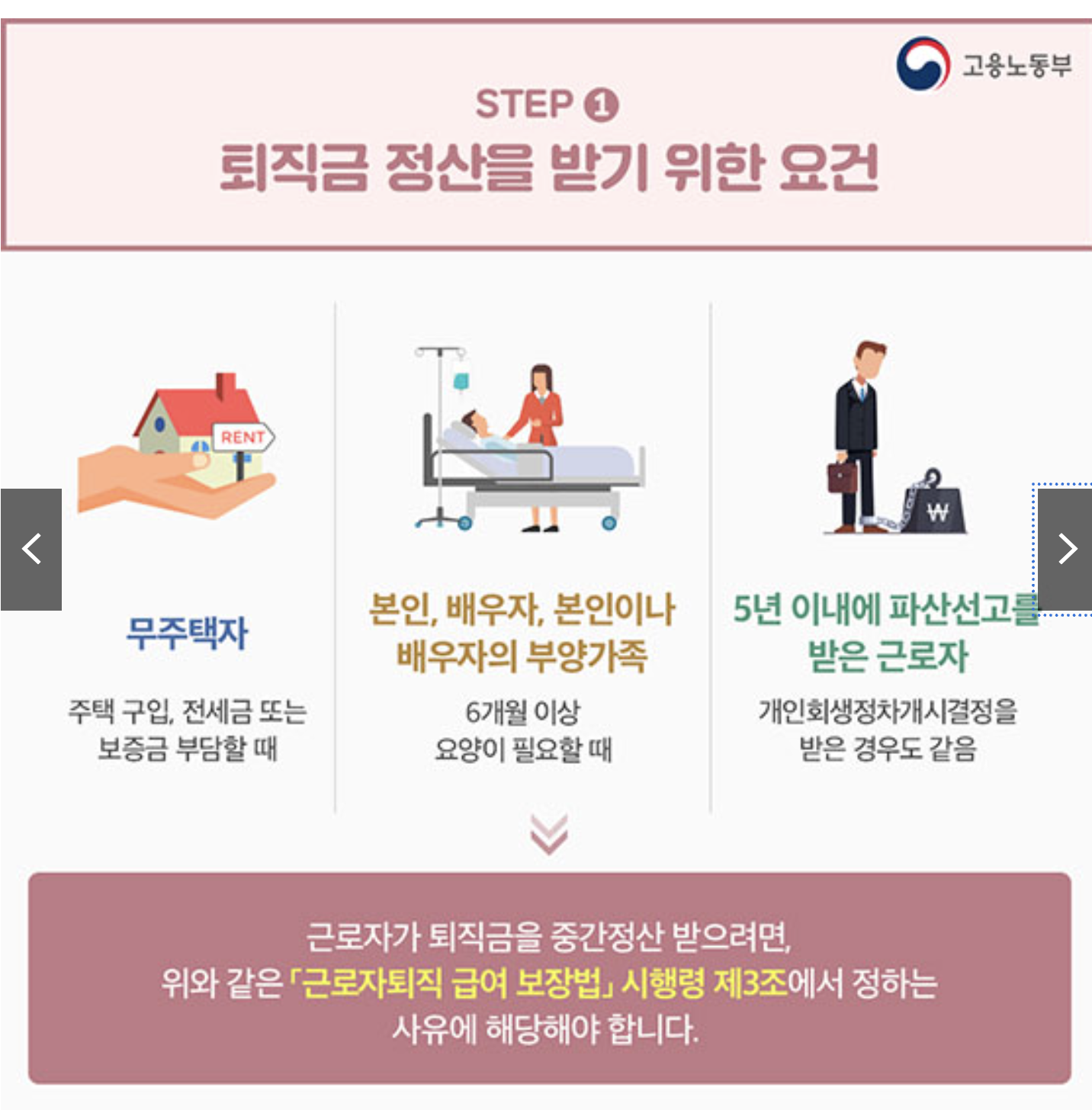 이처럼 퇴직금 중간정산 요건은 단순한 자금 수요로는 불가하며, 법에서 인정하는 ‘불가피한 생활 안정 사유’에 해당해야만 신청할 수 있습니다.