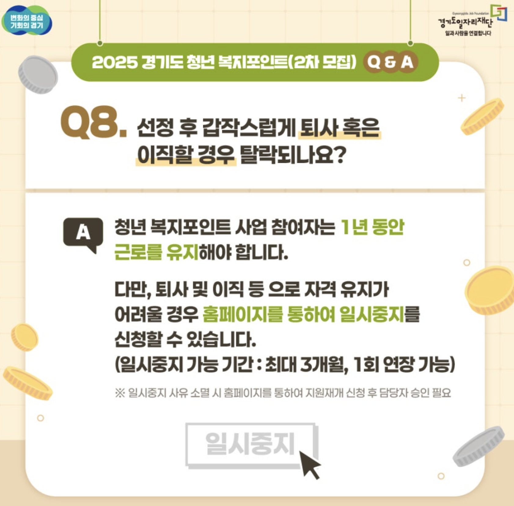 → 이직 후에도 경기도 내 사업장에서 근무한다면 유지 가능합니다. 하지만 근로 공백이 있거나 경기도 외 지역으로 이직할 경우 자격 상실 가능성이 있습니다.