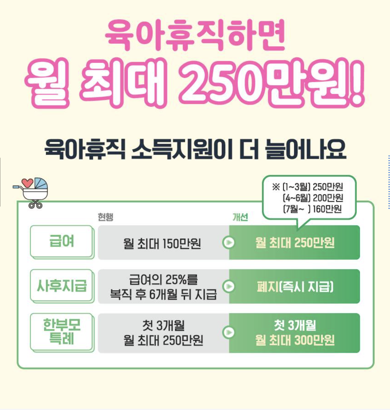- 7개월 이후: 통상임금의 80%, 월 최대 160만 원으로 조정