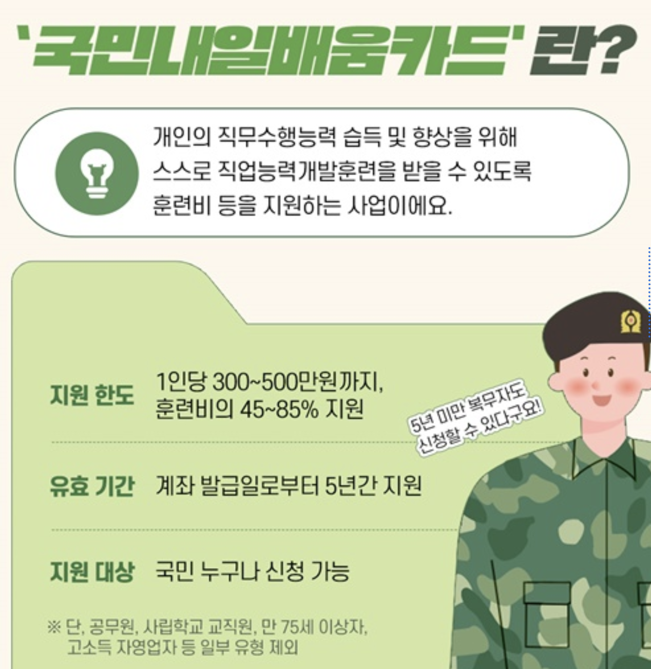 국민내일배움카드는 ‘누구나’ 발급받을 수 있는 제도이지만, 일부 직종 및 조건에 해당하는 경우 지원에서 제외됩니다.