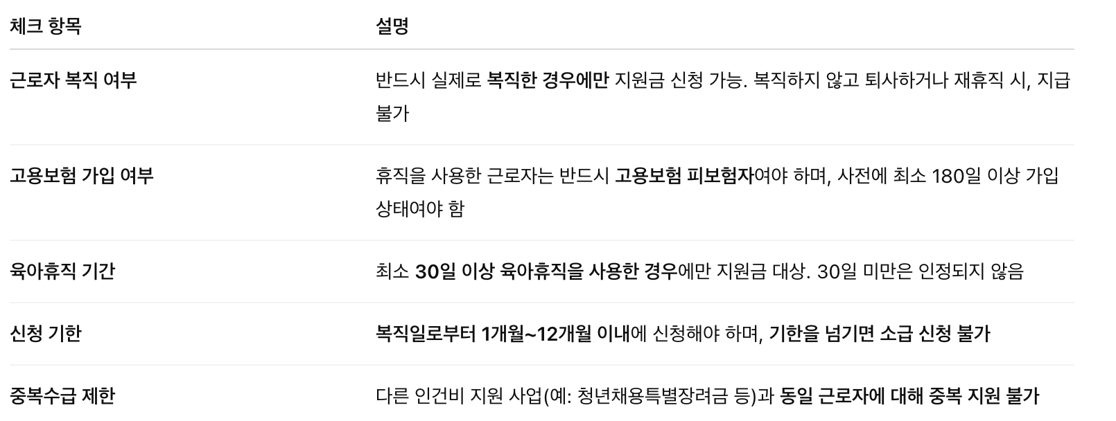 - 직원이 최소 30일 이상 육아휴직을 사용하고 실제로 복직한 경우에만 신청 가능합니다.
