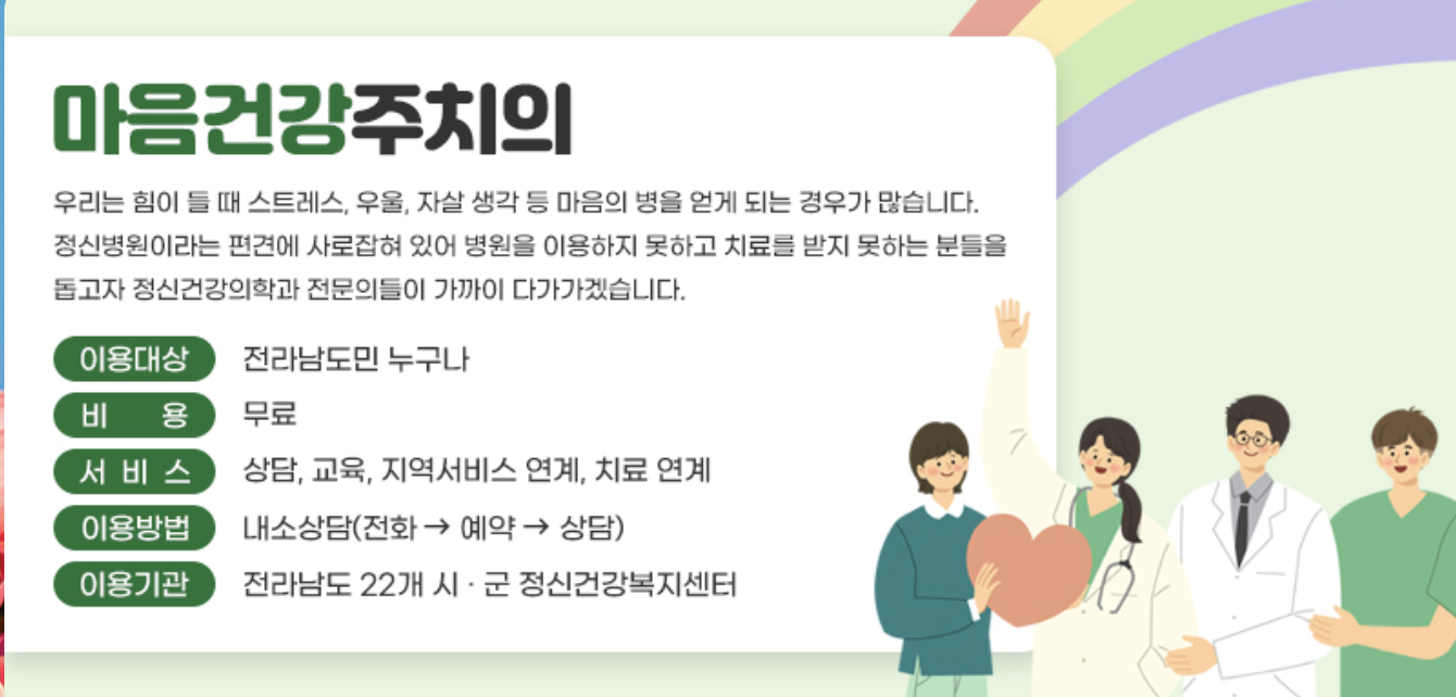 - 서울시는 청년층을 위한 ‘마음건강 토닥토닥’ 프로그램을 별도 운영하며, 모바일 앱 기반 자기진단과 전화 상담을 병행하는 등 접근성을 강화한 것이 특징입니다.