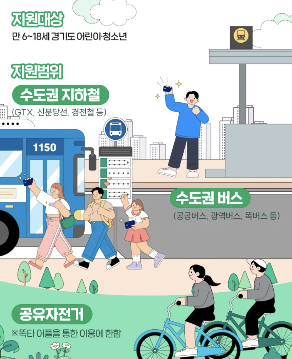 경기도에 거주하는 만 6세~18세 이하 청소년을 대상으로 수도권 대중교통(버스, 지하철, 공유자전거 등) 이용 요금을 전액 환급해주는 제도입니다.